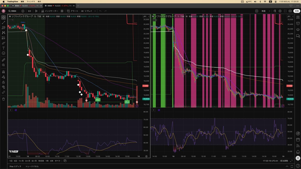 今日のインジ比較です。 左は5分順張りインジ、右は1分vwapインジ これはいいかも #株クラの輪を拡げよう #マンエンマン投資ファミリークラブ #vwap #順張り pic.x.com/S11RBxLne8