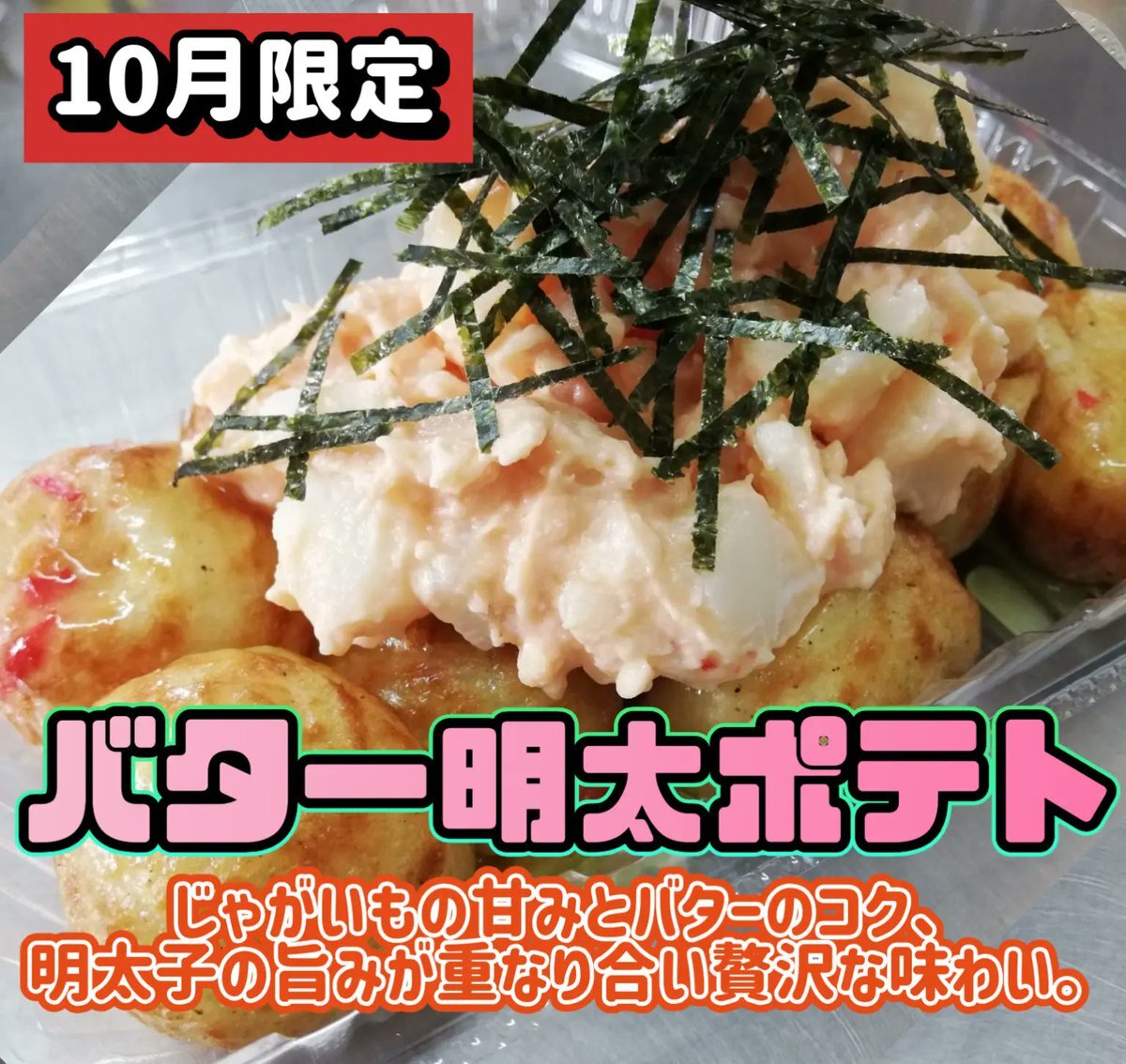 10月20日(月曜日)☀ 今日も11時からオープン! オープン直後から沢山のご来店ありがとうございます! 今月限定の《バター明太ポテト》が残り僅かです! ラストワンの方は超ラッキー🌟ドッサリとポテトがのりますよー😁🥔✨ これからの時間もご来店お待ちしています😌 #たこ焼き.#函館.#たこ焼き菜々
