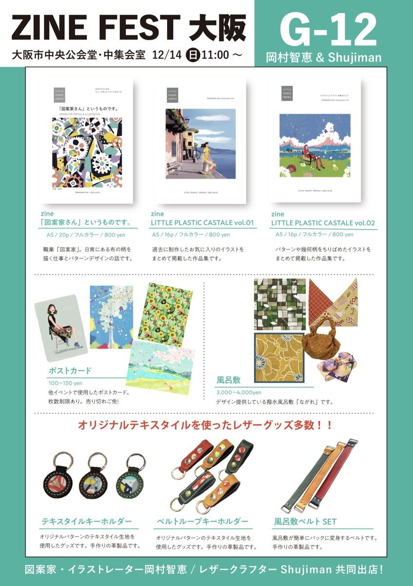 【お知らせ】 12月になりましたね。 ZINEフェス大阪‼️ 昨年の12月に勢いで申込したZINEフェス。 はじめてのZINE制作からの一年の集大成です。 皆さま、楽しみましょう〜 何卒よろしくお願い致します。 #zineフェス大阪 #図案家 #風呂敷 #レザー #イラスト #テキスタイルデザイン @zinefarmtokyo pic.x.com/qKAwoNOb5U
