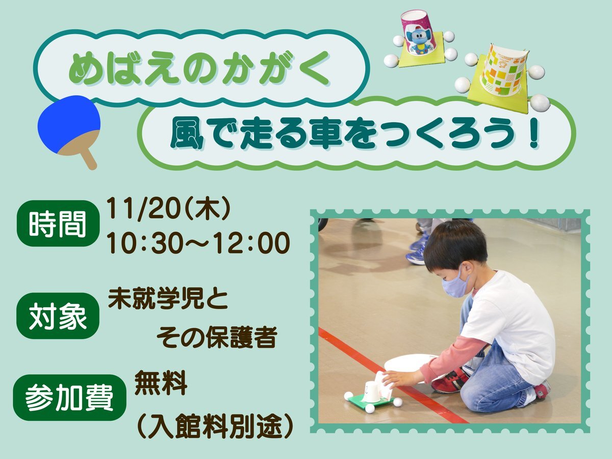 🟦木曜日のイベントは?🟦 🌱11/20㊍ めばえのかがく 「風で走る車をつくろう!」🚗 風を受けると走る車をつくって、どうしたら遠くまで 走らせることができるか考えよう! 時間:10:30~12:00受付(1回20分程度) 対象:未就学児とその保護者 参加費:無料(入館料別途)
