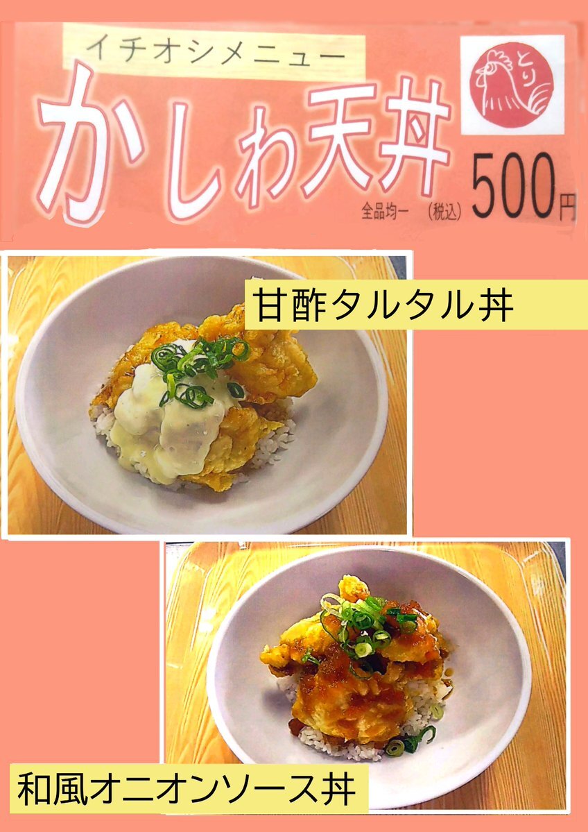 明日は11時から15時までの営業です 明日の日替わり(530円)のメニューは〈油淋鶏、サラダ、みそ汁、ご飯〉です 11月のフェア かしわ天丼(500円)🐔 甘酢タルタル丼、和風オニオンソース丼 22日まで ご注文時にどちらかお伝えください #関大 #食堂 pic.x.com/ZgksPZGMyX
