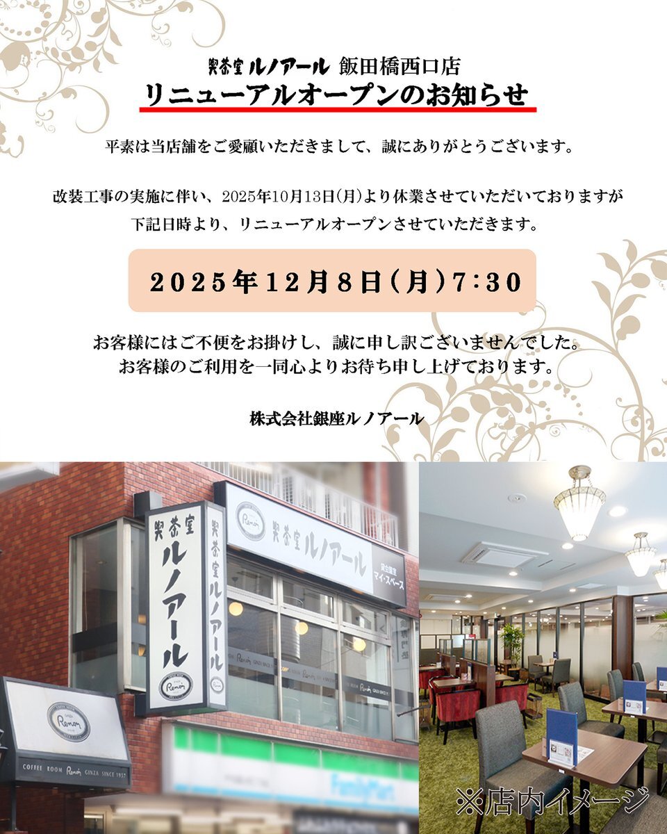 【#リニューアルオープン のお知らせ】 12月8日(月) AM 7:30『#喫茶室ルノアール 飯田橋西口店』がリニューアルオープンいたします! 【JR総武線 #飯田橋駅】 西口より、徒歩約3分。 飯田橋へお越しの際は、ぜひご利用下さい。 詳細はこちら▶x.gd/XXtaB #ルノアール #銀座ルノアール pic.x.com/Ta8woPdVgf