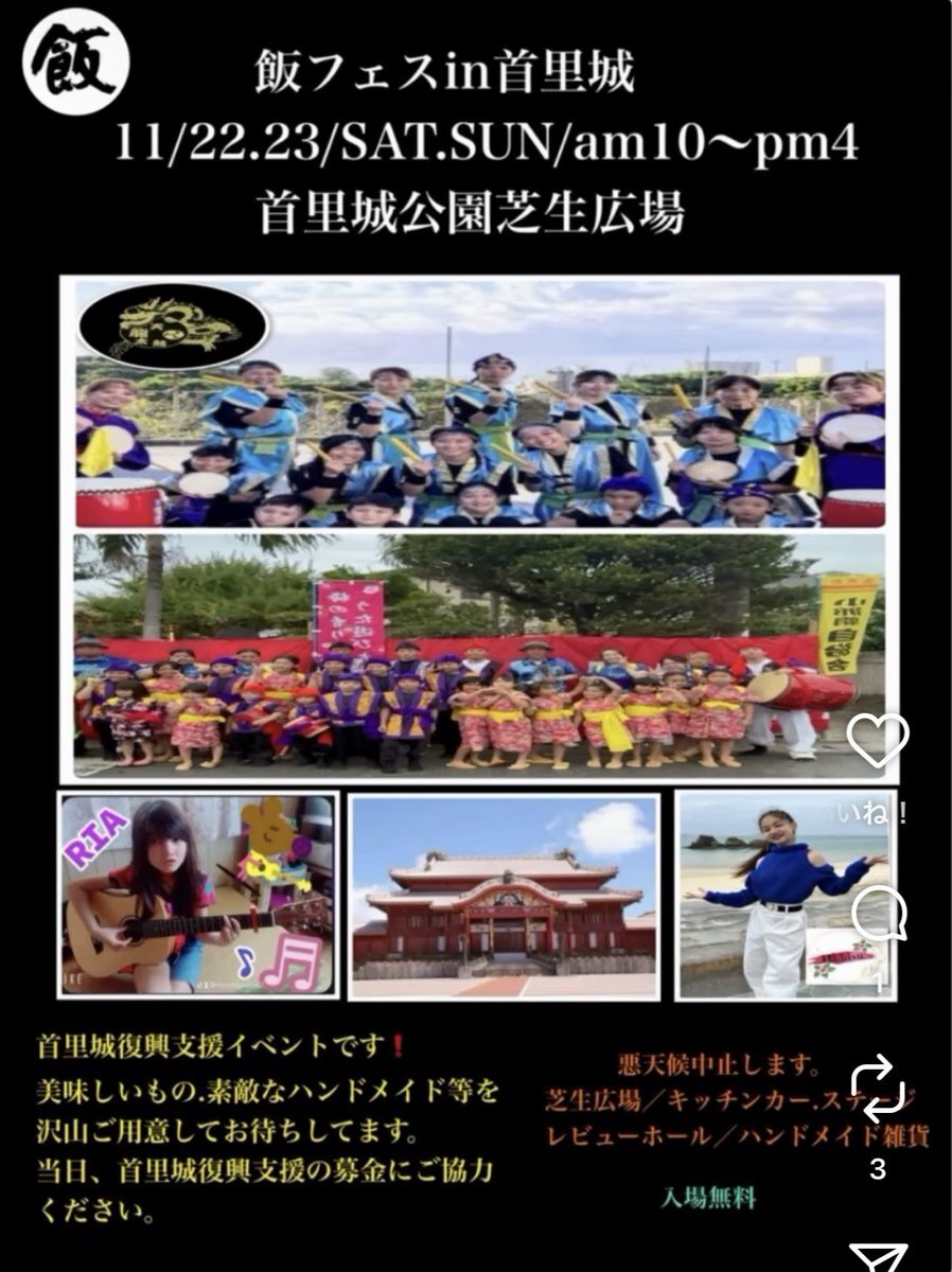 【イベント】 ◾️飯フェスin首里城 ●2025/11/22・23 10:00-16:00 ●首里城公園芝生広場 #沖縄 #那覇 #首里城 #フード #キッチンカー #ステージ #ハンドメイド instagram.com/meshi.fes/ pic.x.com/Qz03ixKVBO