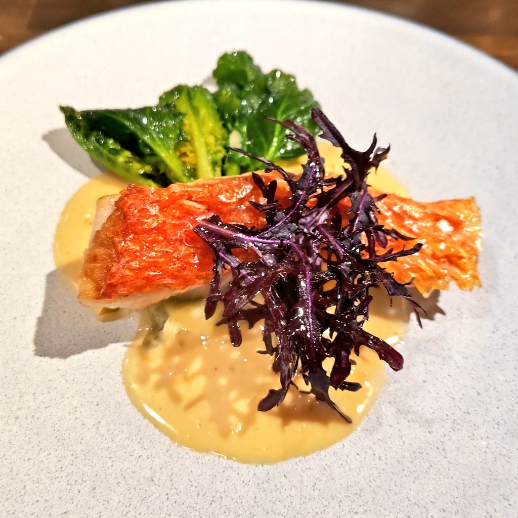 金目鯛のウロコ焼き白ワインソース。甘くトロトロになった上州葱が金目鯛の下に敷かれていてソースと渾然一体。パリパリの皮、しっとり火入れされた身がそなわり最強に見える #馬喰横山 pic.x.com/ntIzFBRhzi