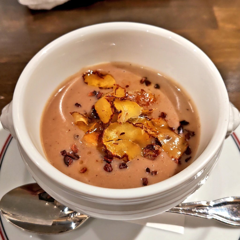 本日の夕食は、大伝馬町のChevalへ。 フォアグラソテー入り和栗とフランス栗のポタージュ。カカオニブと和栗チップスの食感が楽しい♪ 本しめじ平茸セップ茸など色々キノコとホタテのソテーも美味しい。パンが進んでしまう・・・ #馬喰横山 pic.x.com/r9SWT7PTc2