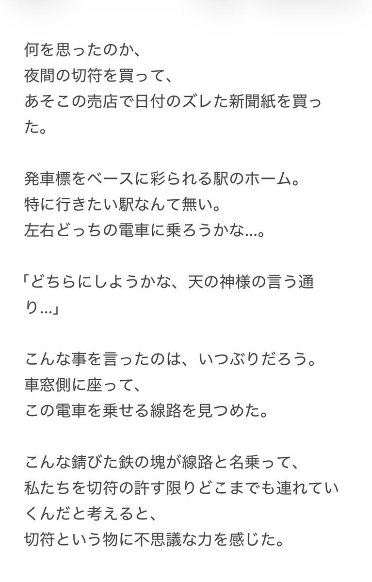 今回の掌編詩小説は、『切符』がキーワードです。よろしければ、感想、フォローもぜひ。 #掌編詩小説 #詩的表現 #毎日文学 #地下鉄をテーマに作品をつくる #切符 #夜 #駅のホーム #電車 #車窓 #線路 #不思議な力 pic.x.com/yBOsgFpJgp x.com/tankazine/stat…
