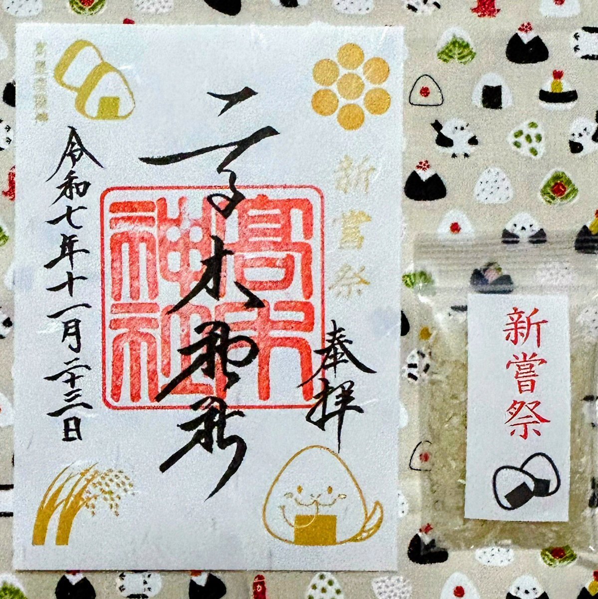 高木神社に参拝しました⛩ 新嘗祭の御朱印にはお米が 付いていました🌾✨ 我が家の神棚にお供えさせて 頂きます☺️ ここに来るとおむすび🍙が 食べたくなります( ´艸`) #高木神社 #御朱印 pic.x.com/F4FWu3TER8