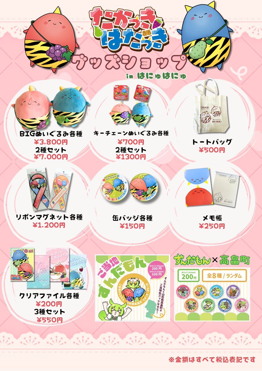 「#世界キャラクターさみっとin羽生2025」 たかっきはたっきブースの販売グッズ一覧です! 今回は #ずんだもん × #高畠町 のグッズも!!! お店の場所も要チェック!! ーースタッフ🧑💻 #はにゅはにゅ #山形県