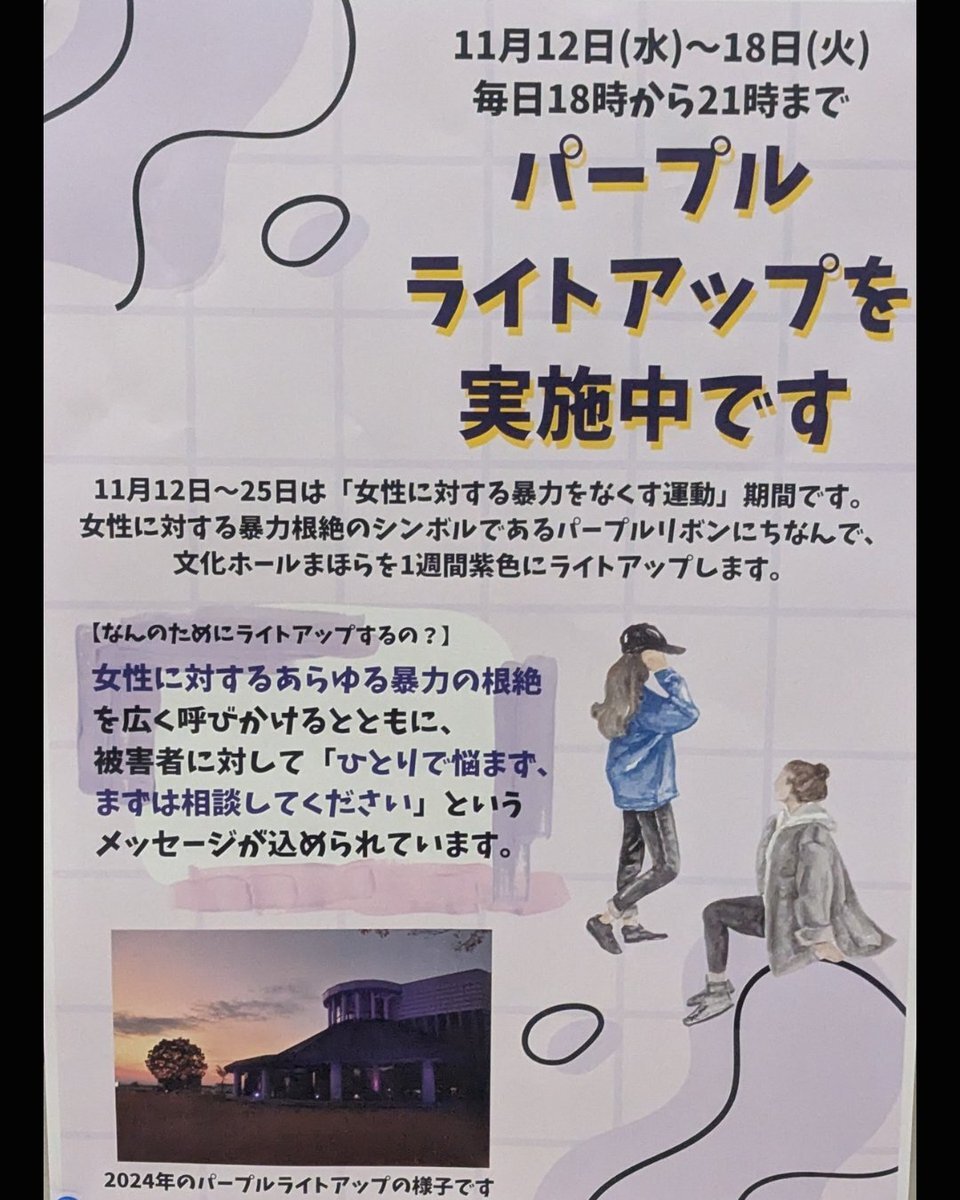 【パープル🟣ライトアップ💡】 11月12日~18日までの1週間、パープルライトアップが実施されます🎀 近くでご覧になる際は、文化ホール周辺が大変暗くなっておりますので、足元に気をつけてお越しください! ※18時点灯 #高畠町 #高畠町文化ホール #パープルライトアップ pic.x.com/GiAOFZBjoF