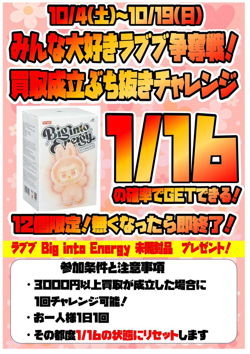 大人気企画早くも復活! 10/4(土)~10/19(日)の期間限定! 買取成立ラブブぶち抜きチャレンジ開催! 今回は3000円以上の買取成立でチャレンジ可能です! 16枚のオリパから1枚引いて当たりが出ればLABUBUのBig into Energyのピース未開封をプレゼント! x.com/THEBUYERS_CARD…
