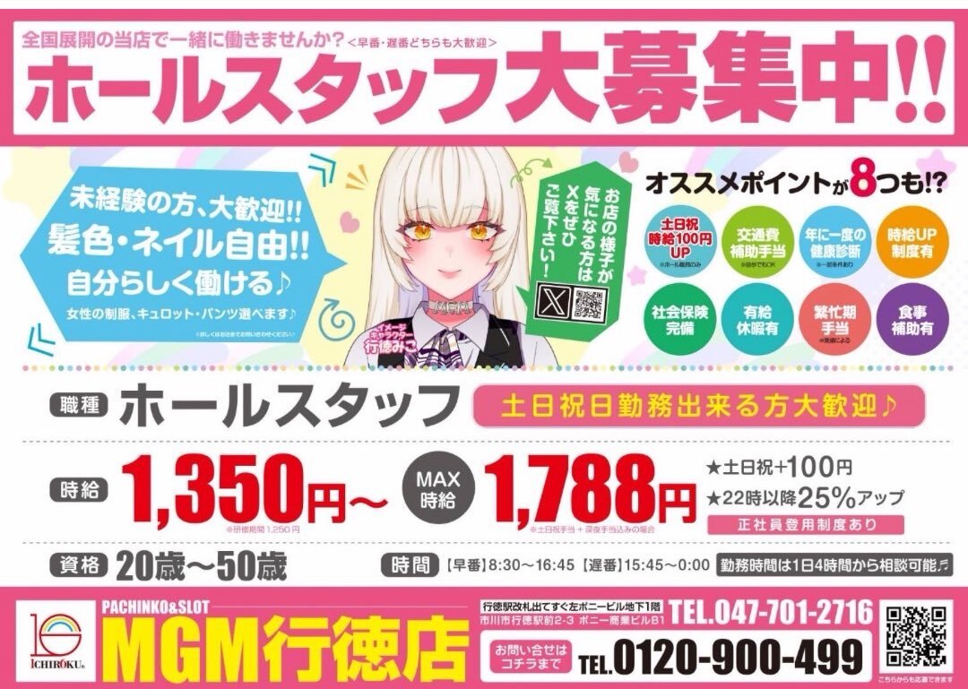 オシャレ我慢しないで働ける🎀 髪色自由!ネイルOK!笑顔必須!😆 楽しく稼ぎたいならここ🎰✨ #バイト募集 #ネイルOK #髪型自由 #MGM行徳店 pic.x.com/Bvr2OVTjgO