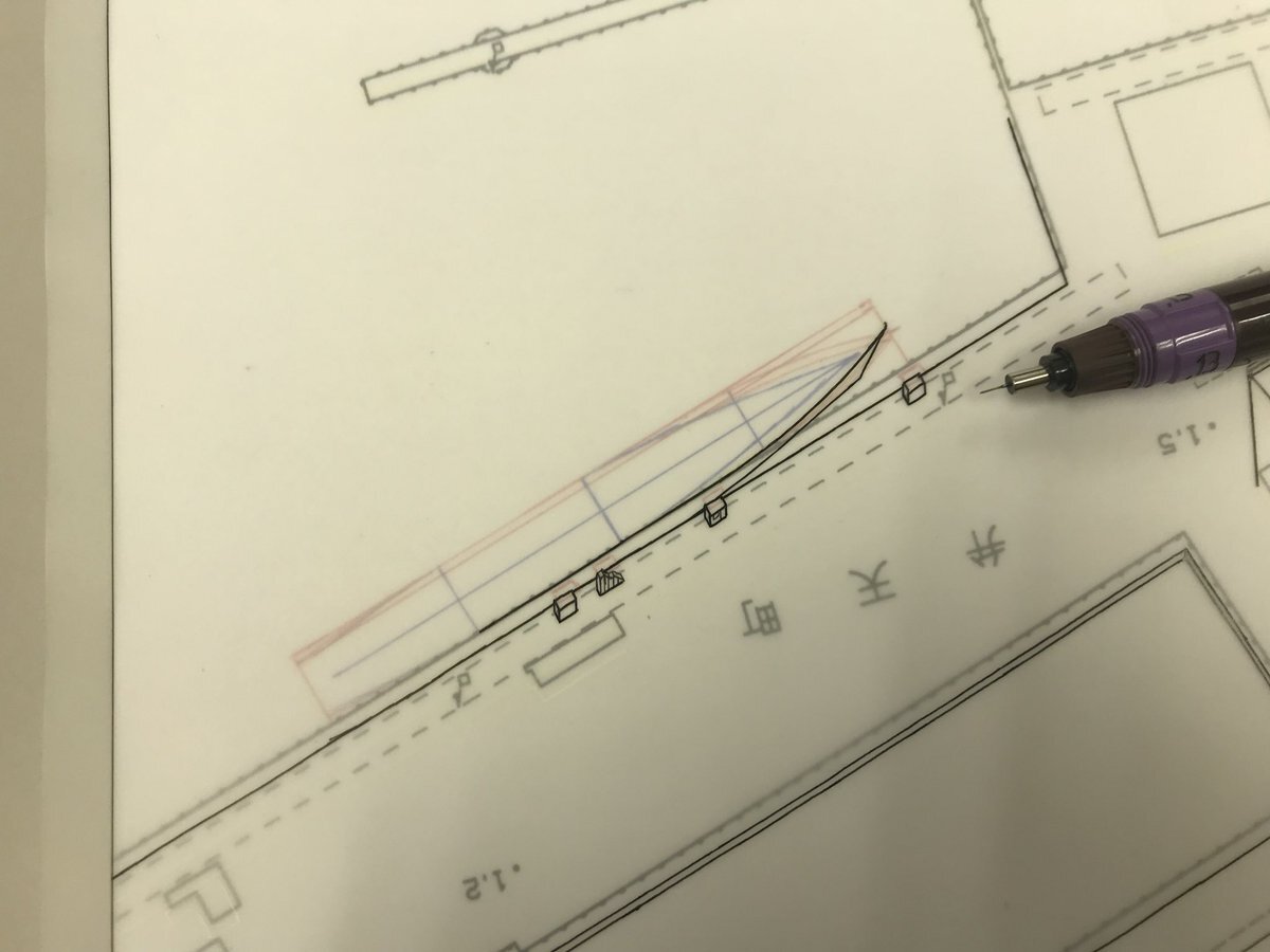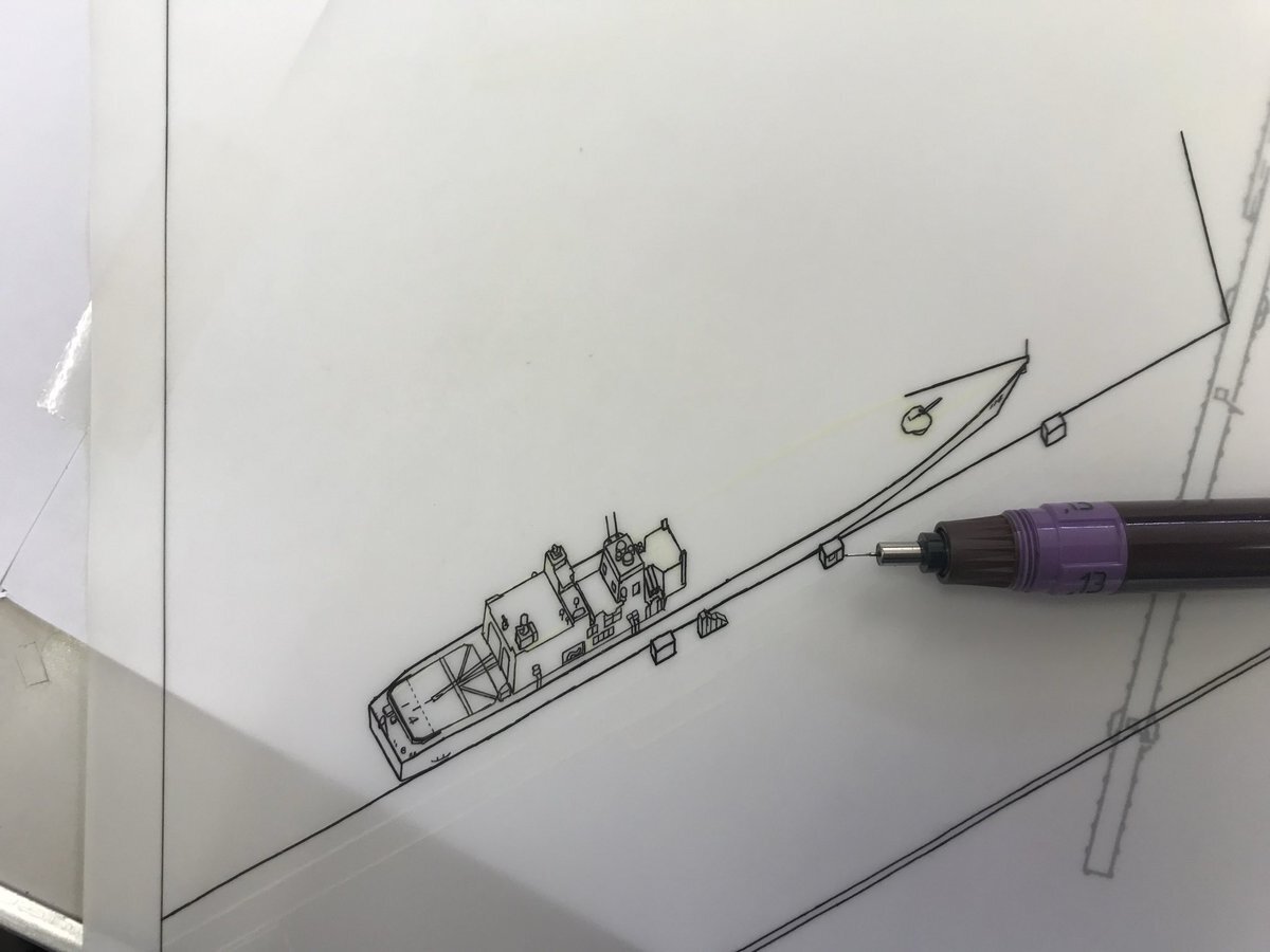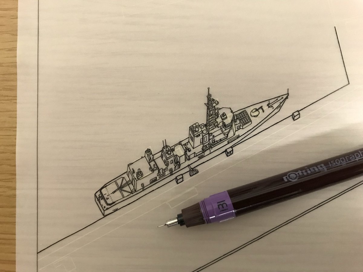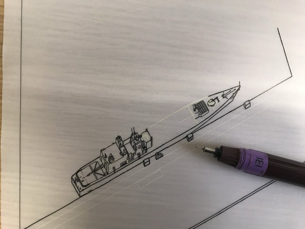 函館バーズアイマップに護衛艦すずなみを描く様子。原画の縮尺1600分1に基づいて全長、全幅など出来る限り正確に描いたものです。VLSのセルの数もそのままにロットリング0.13で描いたりと。 #鳥瞰図 #青山大介 #函館バーズアイマップ pic.x.com/gtihp1iYiP