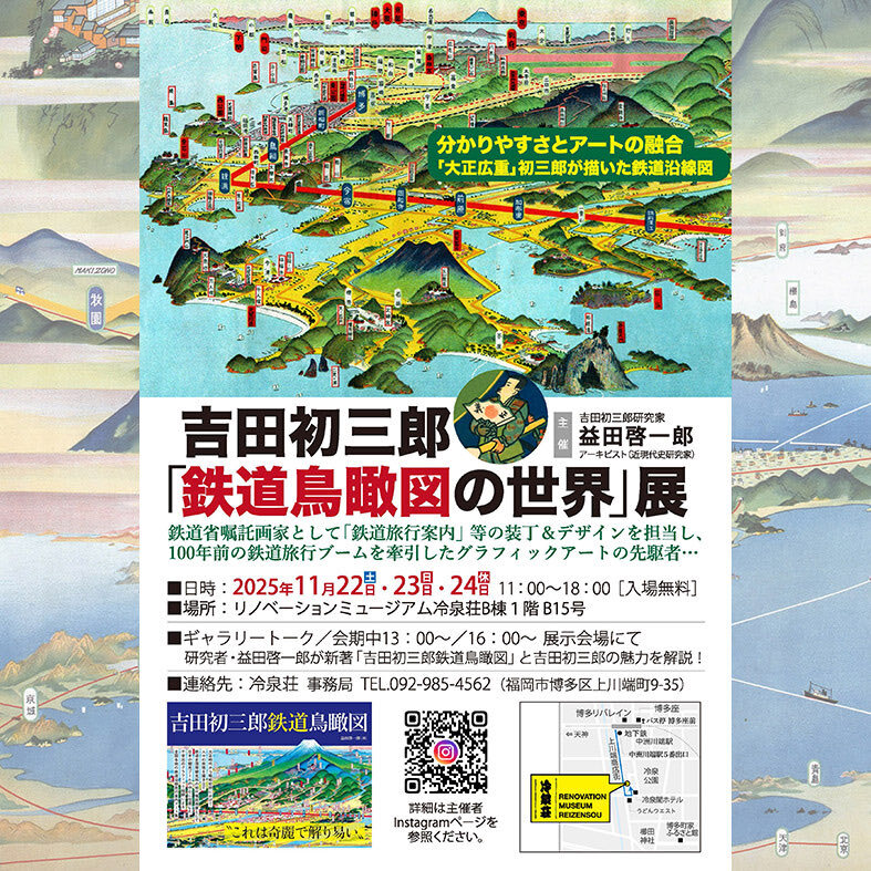 11月22日(土)〜24日(祝)吉田初三郎「鉄道鳥瞰図の世界」展開催!拙著「吉田初三郎鉄道鳥瞰図(三才ブックス)」発売記念。入場無料・リノベーションミュージアム冷泉荘 B棟1階 B15号にて。13時&16時ギャラリートーク(毎日在廊予定)。 #冷泉荘 #上川端 #吉田初三郎 #鳥瞰図 #鉄道 #初三郎展 pic.x.com/VixuVRzWNy