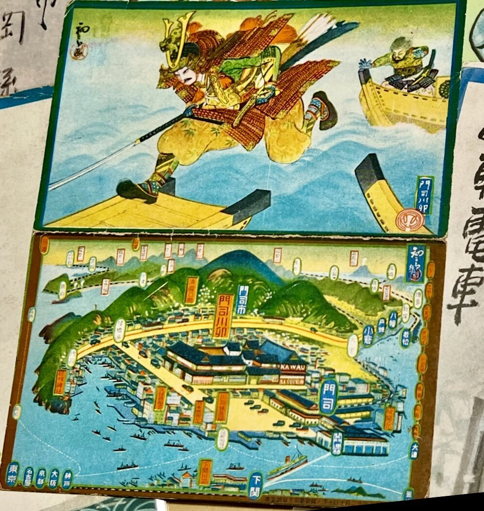 吉田初三郎『門司川卯』絵葉書は2枚綴り。 1枚は現門司港駅そばにあった旅館、もう1枚は壇ノ浦の合戦”義経の八艘跳びの図”を初三郎風にアレンジした作品で、二代広重作品や北尾重政の耕書堂作品が下敷きになっているようで色々調べたくなった♫ #吉田初三郎 #門司港 #鳥瞰図 pic.x.com/bEf2CwWhiv