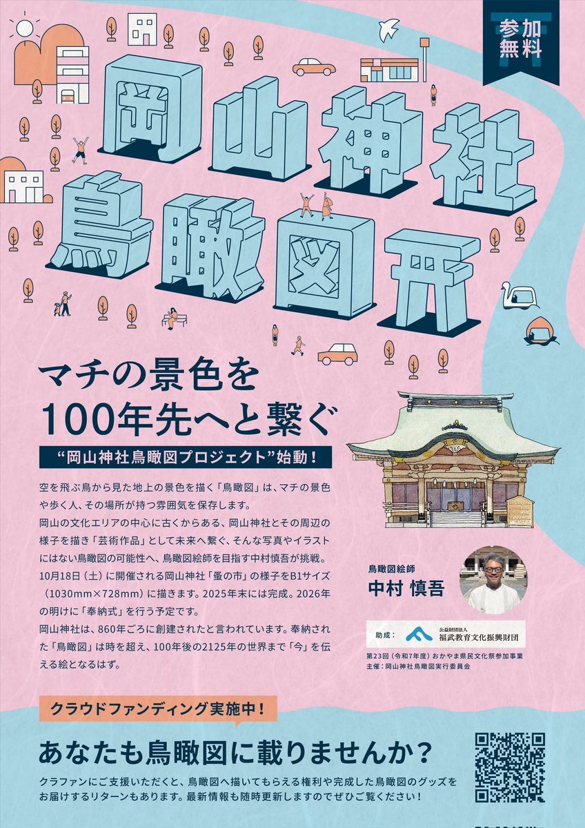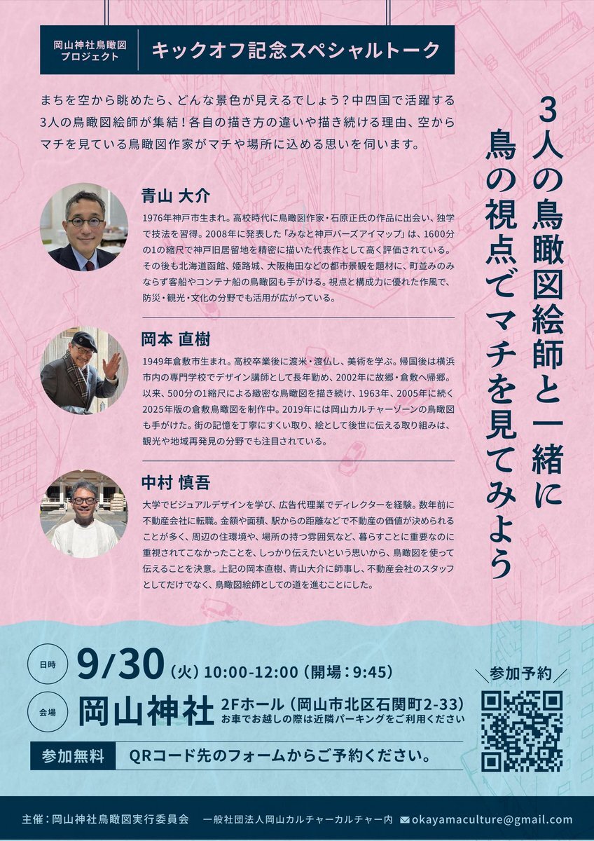 9/30 10時〜岡山神社にて イラストレーター中村慎吾さんが新しく挑戦するプロジェクト #岡山神鳥瞰図 のトークイベントを開催! 僕も、実行委員を担う(一社)岡山カルチャーカルチャー #おかカル (岡山経済新聞の運営団体)として、ファシリテーターを務めさせていただきます。 #鳥瞰図 pic.x.com/3xpAXEMUj7