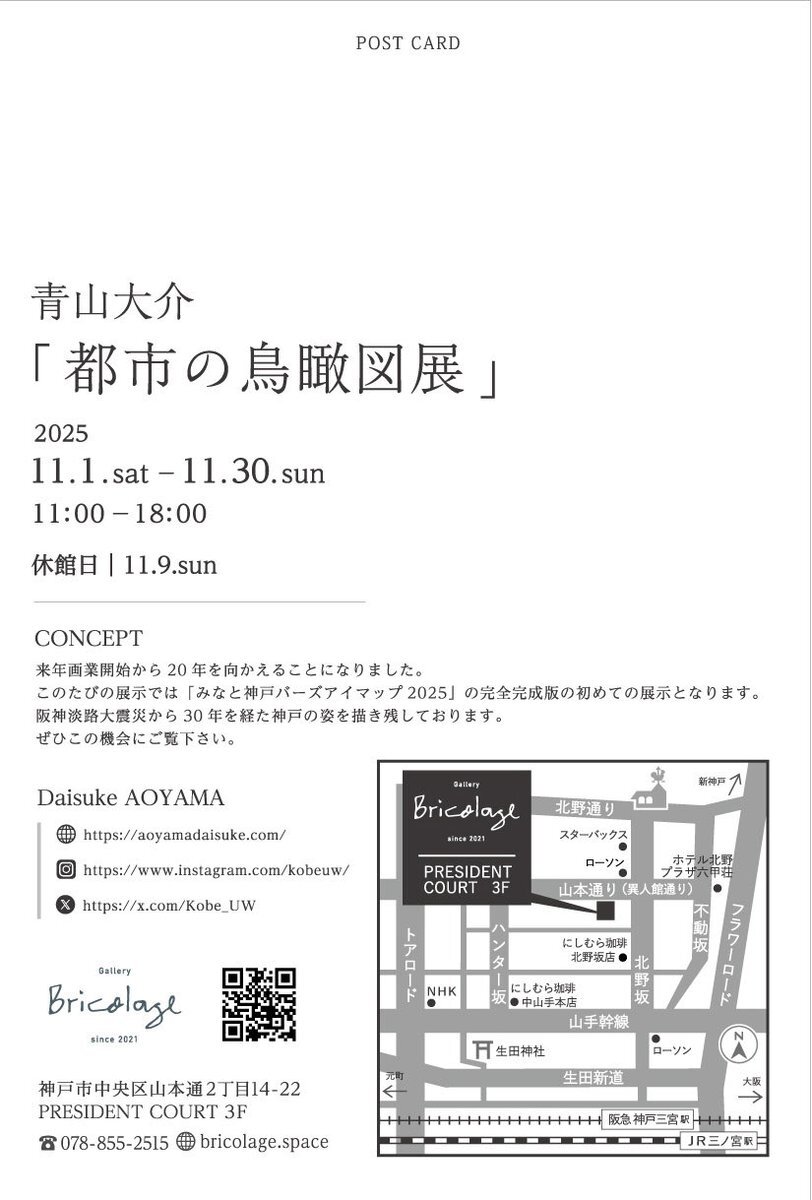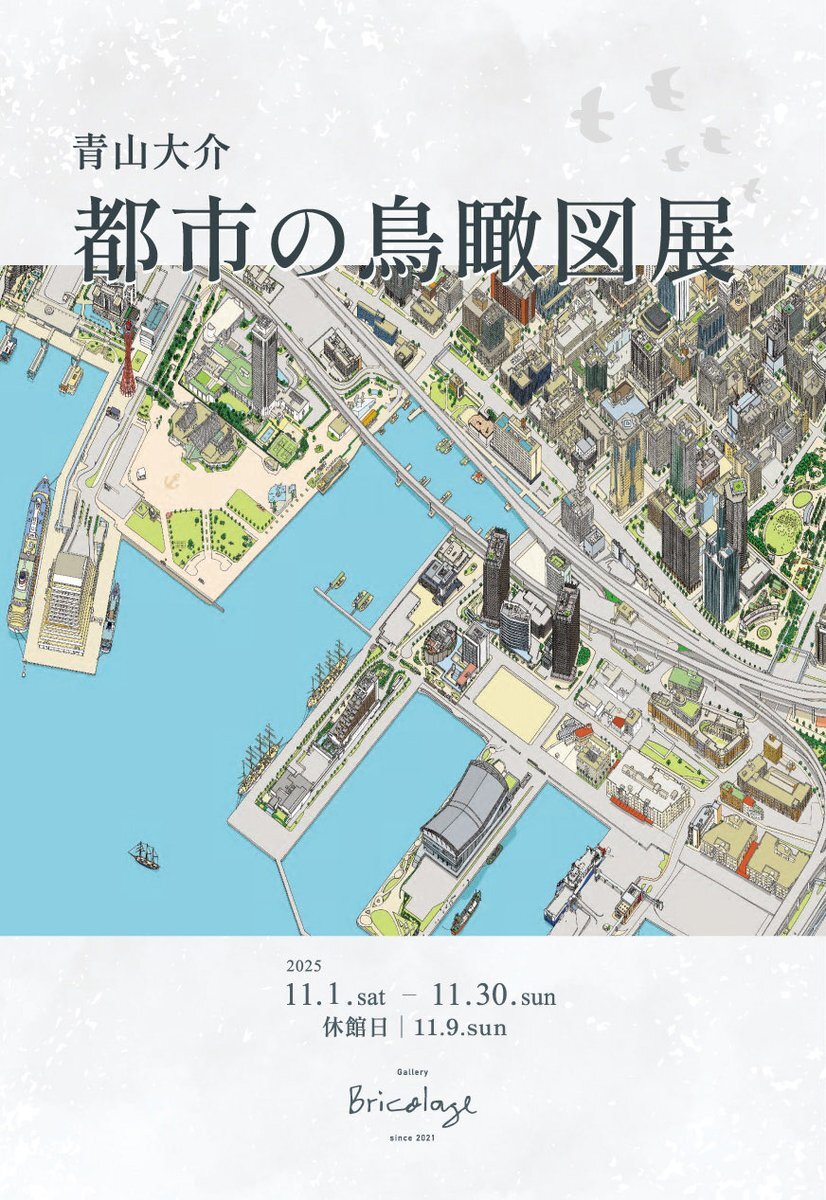 Gallery Bricolageでの個展のお知らせ 会期 11月1日-11月30日(9日休館) 時間 11時-18時 場所 神戸市中央区山本通2丁目14-22 PRESIDENT COURT 3階 会場Webサイト bricolage.space 先日完成をした「みなと神戸バーズアイマップ2025」完全完成版 初お披露目の機会になります。 #鳥瞰図 #神戸 pic.x.com/oXsunBE7dy