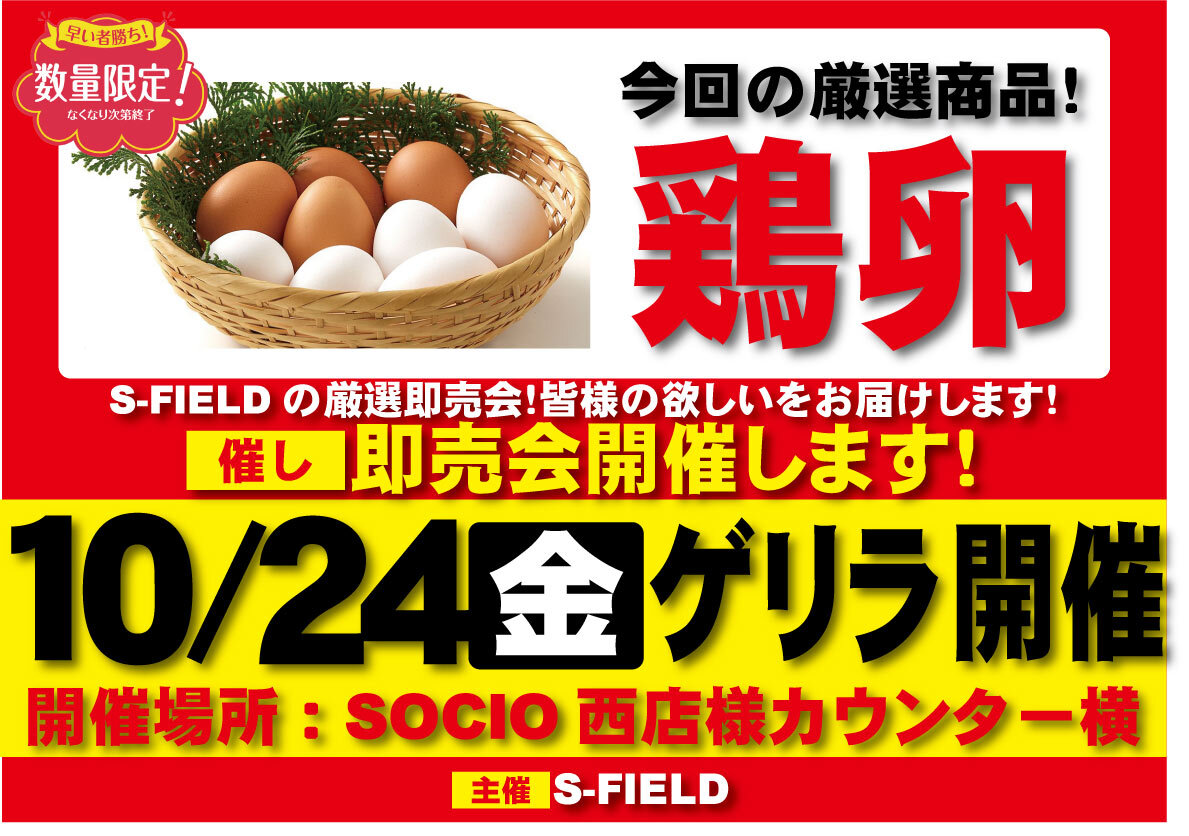 【明日はS-FIELD 厳選即売会!】 📅10/24(金) ゲリラ開催決定! 今回お届けするのは── 選び抜かれた “こだわりの鶏卵”🥚 数量限定、完売必至。 SOCIO西店カウンター横にて開催。 静かに、熱く。 一瞬でなくなる、その鮮度を。 #ソシオ西店 #S_FIELD #即売会 #ゲリラ開催 #限定販売 #鶏卵 pic.x.com/qkoL1LnSYY