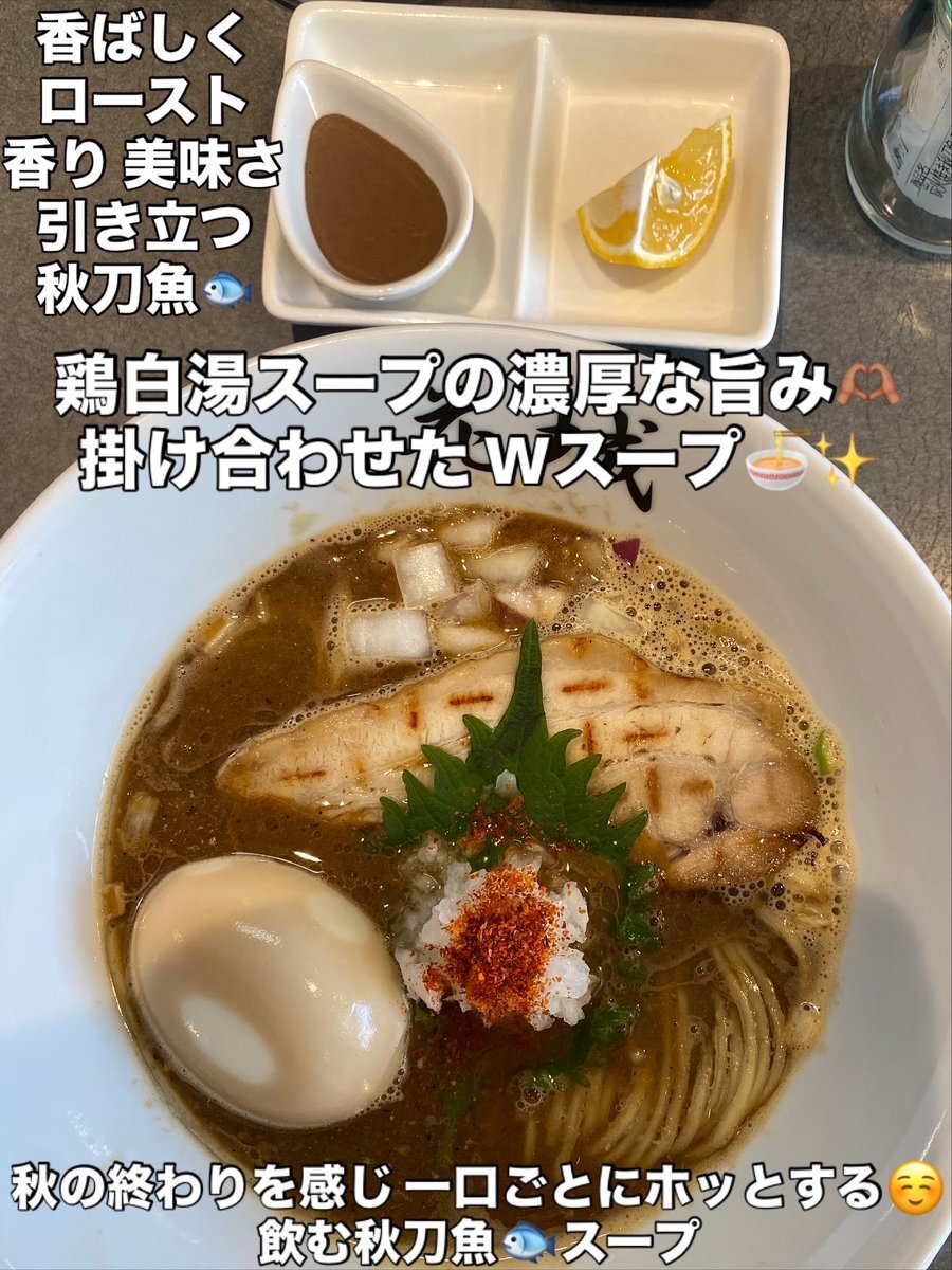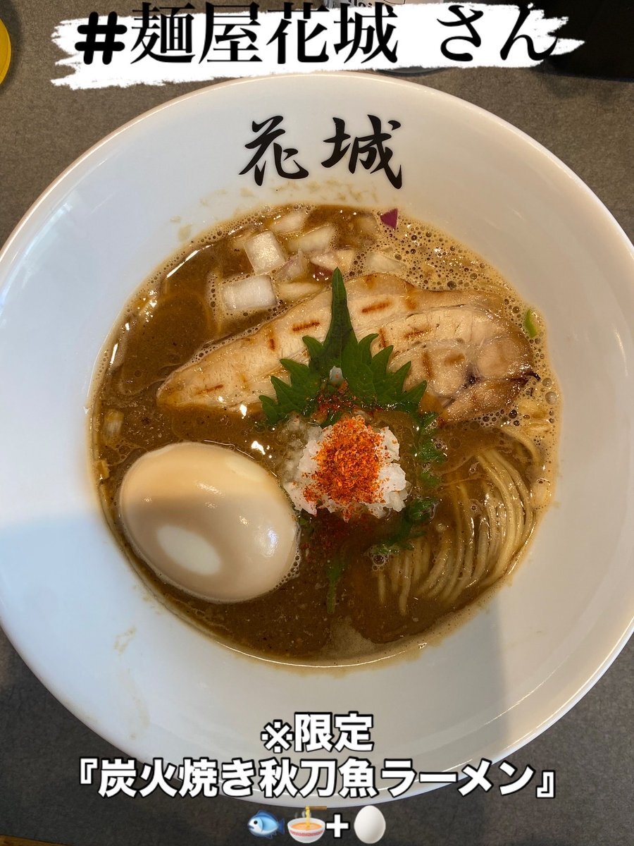5-11/20-266 出勤前🪫lunch #麺活🍜 #麺屋花城 さんへ🚙💨 ※限定 『炭火焼き秋刀魚ラーメン』🐟🍜+🥚 頂きました♪ 香ばしくローストされ 香り 美味さ 引き立つ秋刀魚🐟 鶏白湯スープの濃厚な旨みを 掛け合わせたWスープ🍜✨ 秋の終わりを感じ 一口ごとにホッとする☺️ 飲む秋刀魚🐟スープ 御馳走様🙏 pic.x.com/Q76iZskBMV