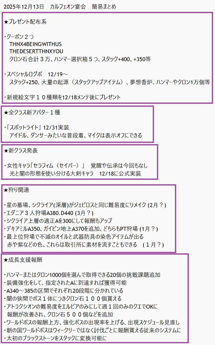 改めて、昨日(12/13)のカルフェ宴会まとめ! いつものように何か間違えあったらすみません🙏 クーポンコピペ用 THNX4BEINGWITHUS THEDESERTTHNXYOU まだまだここで紹介されてないアプデを運営は隠しているはずw #黒い砂漠 #黒い砂漠PC #黒い砂漠_CONSOLE pic.x.com/e0Fi7kSgck