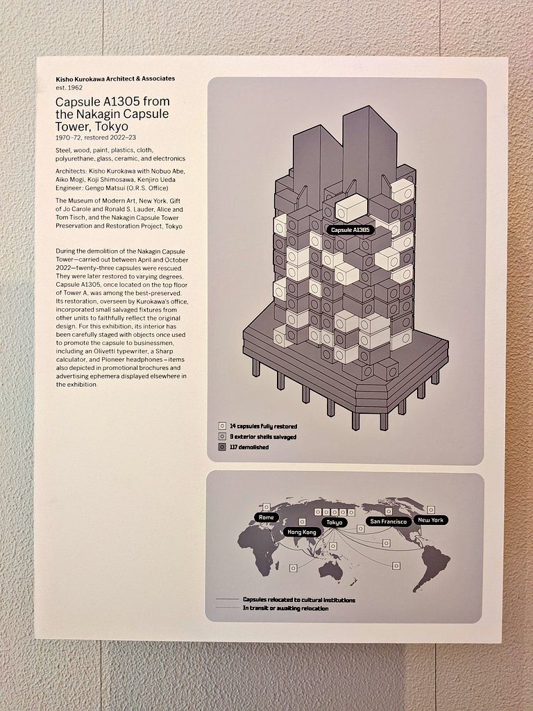 the Many Lives of the Nakagin Capsule Tower(邦題:「中銀カプセルタワービルの多彩な歴史」展) 解体されたカプセルの一つがMOMAにやってきたのを記念して展覧会が開催されています。展覧会は1年続くようです。来館者全員が興味津々の目で見ていたのが印象的でした。 #黒川紀章 #kishokurokawa pic.x.com/G6YQsswCGb