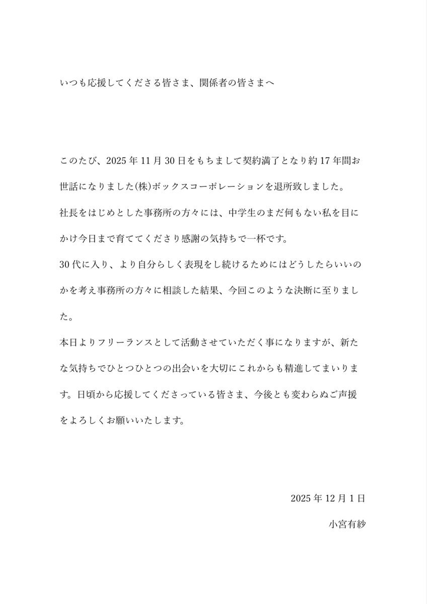 #ラブライブ!の #黒澤ダイヤ 役などで知られる 声優の #小宮有紗(31)が1日、自身のXを更新! 11月30日をもって契約満了のため 約17年間所属した事務所を退所したと発表した! 今後はフリーで活動する! 今年も残り一カ月となったこの日 人気声優たちが新たな道を踏み出した! pic.x.com/8fwIKIPwK1