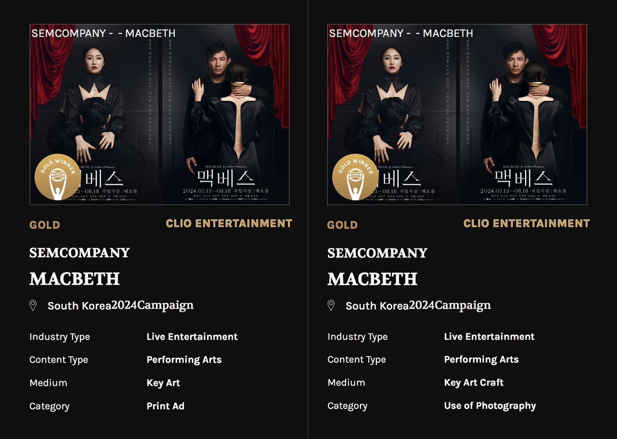 韓国の国立劇場へオルム劇場で上演されたファンジョンミンさんとキムソジンさんの演劇「MACBETH」のポスター🗡️👑が世界三大広告賞の一つであるClio AwardsのClio Entertainmentでkey art、key art craft の2部門でゴールドを受賞しました🏆 #맥베스 #MACBETH #황정민 #김소진 #ClioEntertainment pic.x.com/LWzaaXc7WI