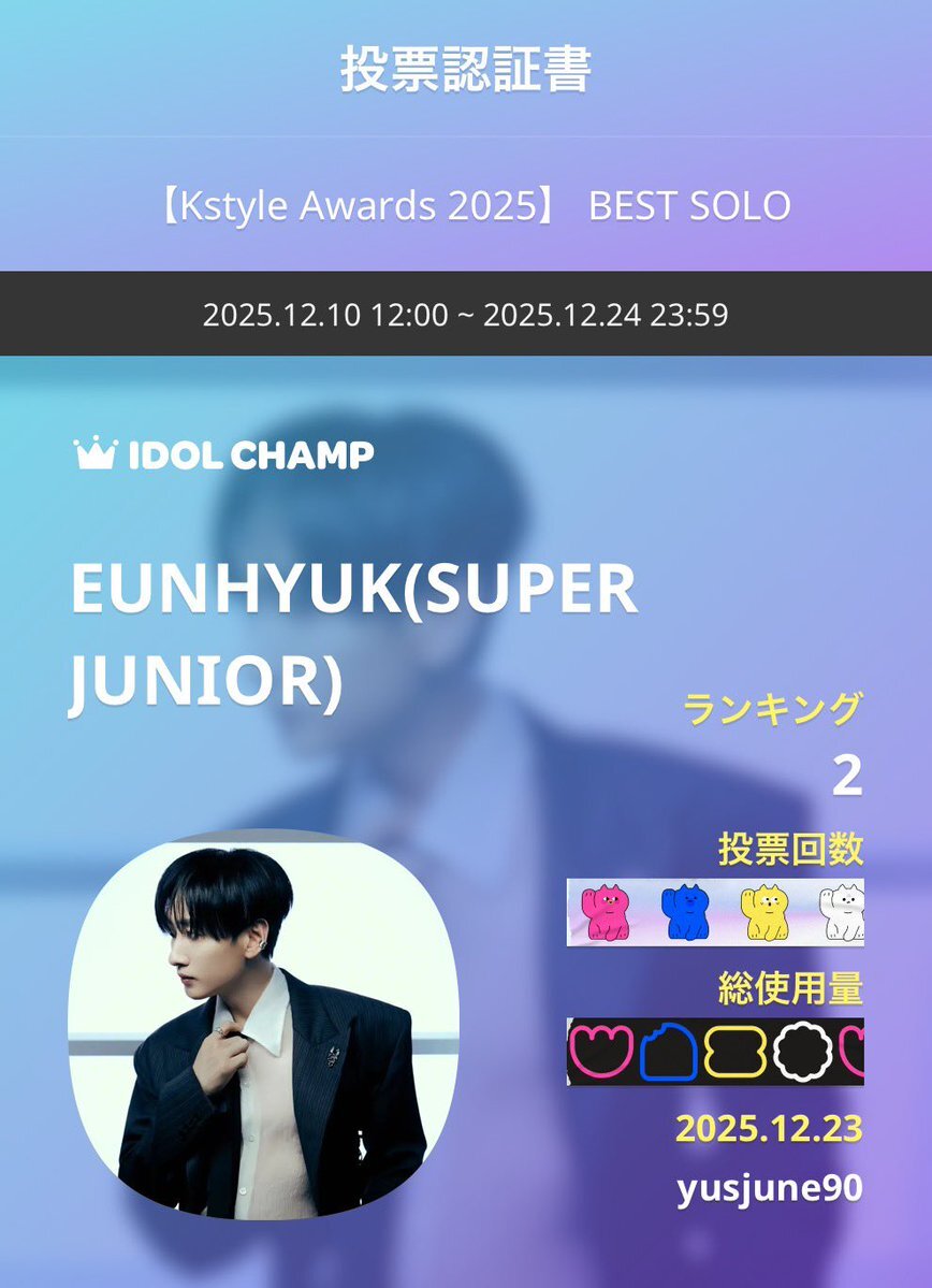 2位にランクアップしてたよ!🥹💙💙24日23時59分まで!1位にはオリジナルトロフィー🏆授与✨上半期1位だったからまた1位になってほしいな🥹💙ラジオでヒョクちゃんの曲が流れたのも嬉しかった🥹 🩷投票🩷 tinyurl.com/ytcvthjc #SUPERJUNIOR #은혁 #EUNHYUK #KstyleAWARDS pic.x.com/7LRvZqCitV