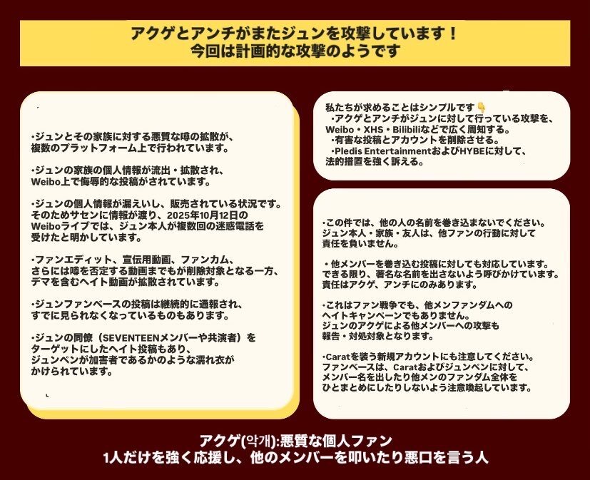 組織ぐるみのアンチ… こんな人たちがCARATなんて悲しい😭 とても危険な行為です💦 PLEDIS、HYBE、XCSSの皆様 厳正なる処置をお願いいたします🙏🙏🙏 じゅんぴとご家族を守ってください🙇🏻‍♀️ 笑顔を奪うようなことはしないで😭 #XCSSProtectJunhui #JUN # #문준휘 @pledis_17 @pledis17_STAFF x.com/pun_seventeen/…