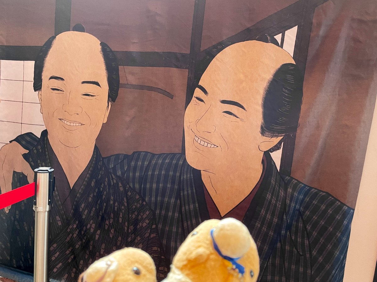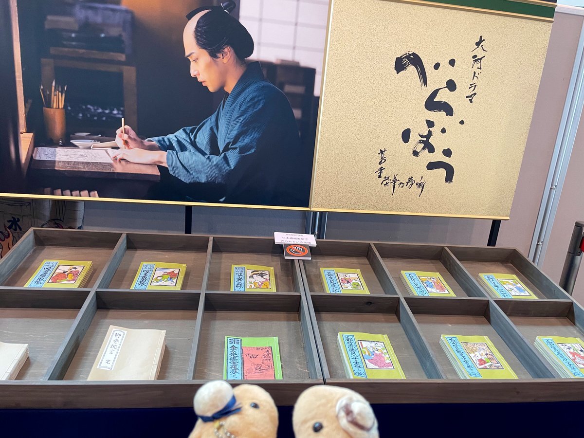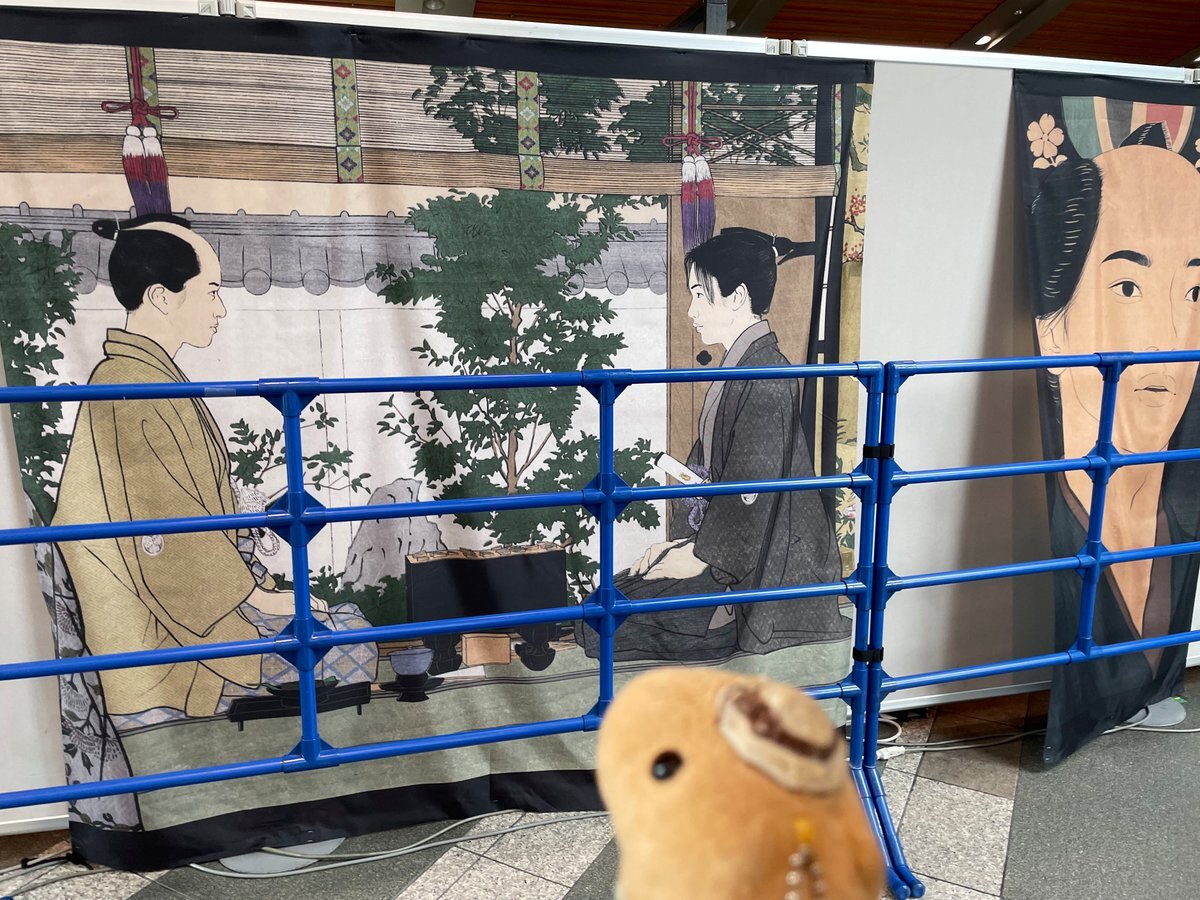 続き。オープニングに出るイラストもいくつか展示。懐かしい名場面です。蔦重どーもくんバッチをもらいました。最後は隊長の殿気分ドヤ顔で。隊長たちとても楽しかったようです。 #お出かけ隊 #10月 #カピバラさん #NHK大阪 #大河ドラマべらぼう #ぬい活 #ぬい撮り #どーもくん pic.x.com/GBNwosqxha