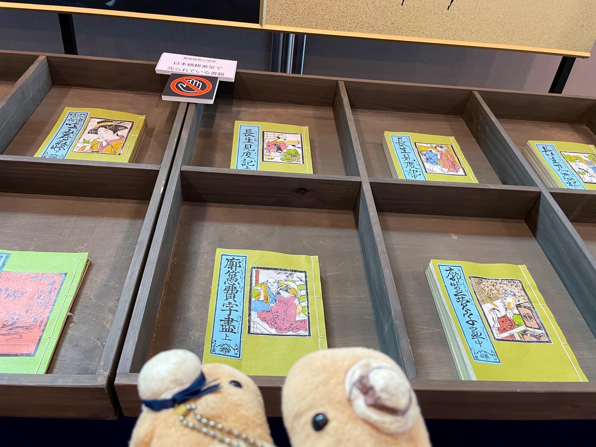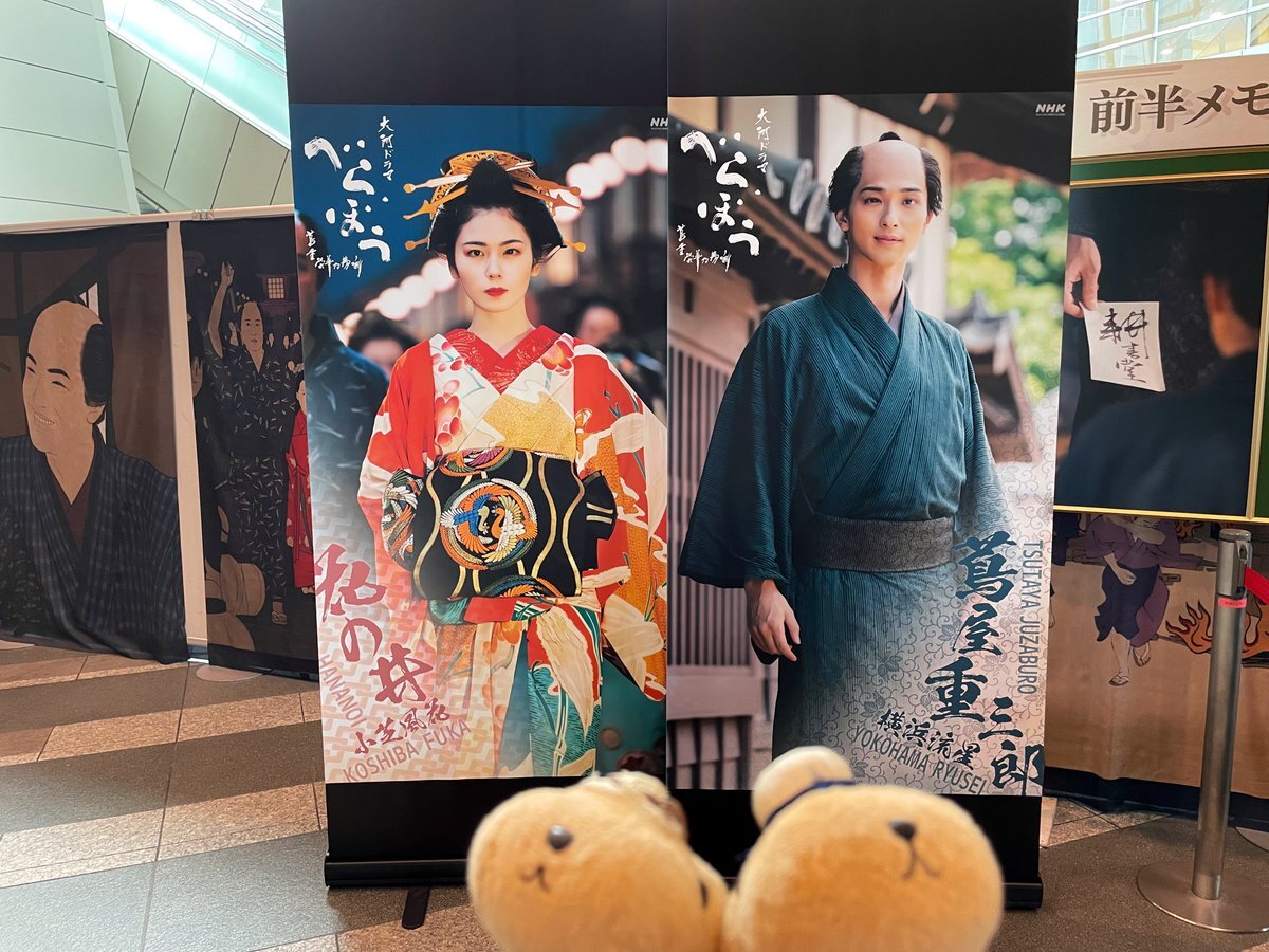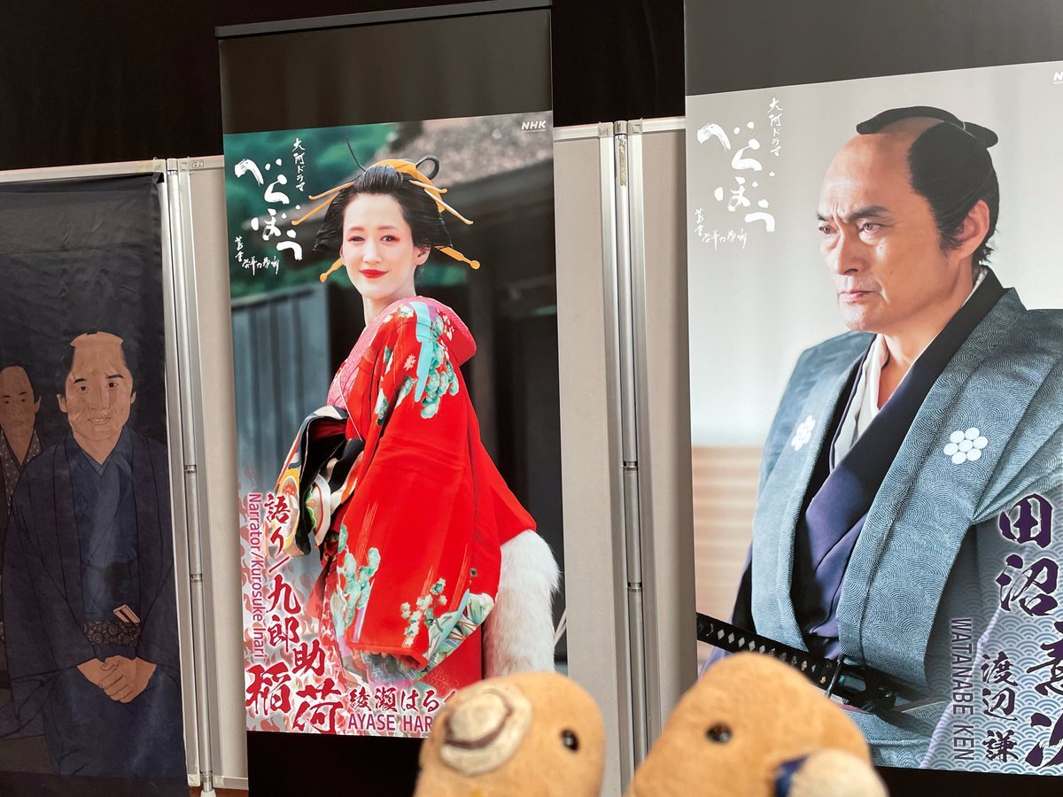 続き。オープニングに出るイラストもいくつか展示。懐かしい名場面です。蔦重どーもくんバッチをもらいました。最後は隊長の殿気分ドヤ顔で。隊長たちとても楽しかったようです。 #お出かけ隊 #10月 #カピバラさん #NHK大阪 #大河ドラマべらぼう #ぬい活 #ぬい撮り #どーもくん pic.x.com/GBNwosqxha