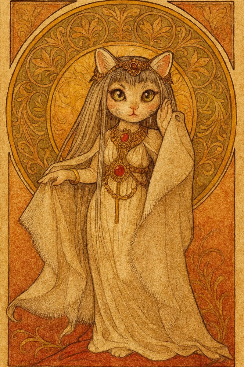 今朝方にできた、バステトちゃん🐈‍⬛ AIに画像を投げてミュシャ風な加工をしてみました! まるで絵画、そして"ネコ顔"になった(笑) #ミュシャ風 #アールヌーヴォー #ドールカスタム #オリジナルドール #手作りドール #100均DIY #創作好きさんと繋がりたい pic.x.com/Z1rDdZSri7