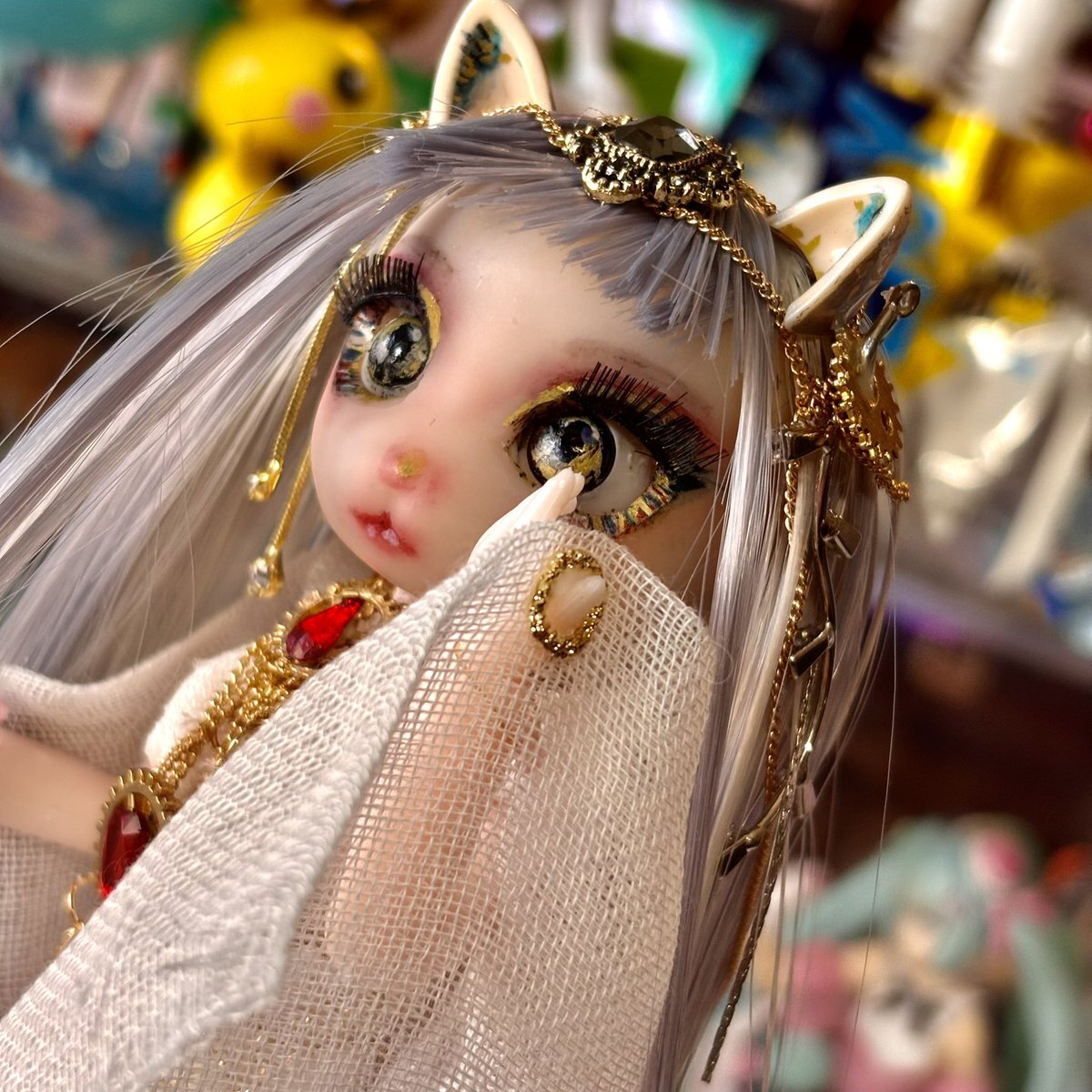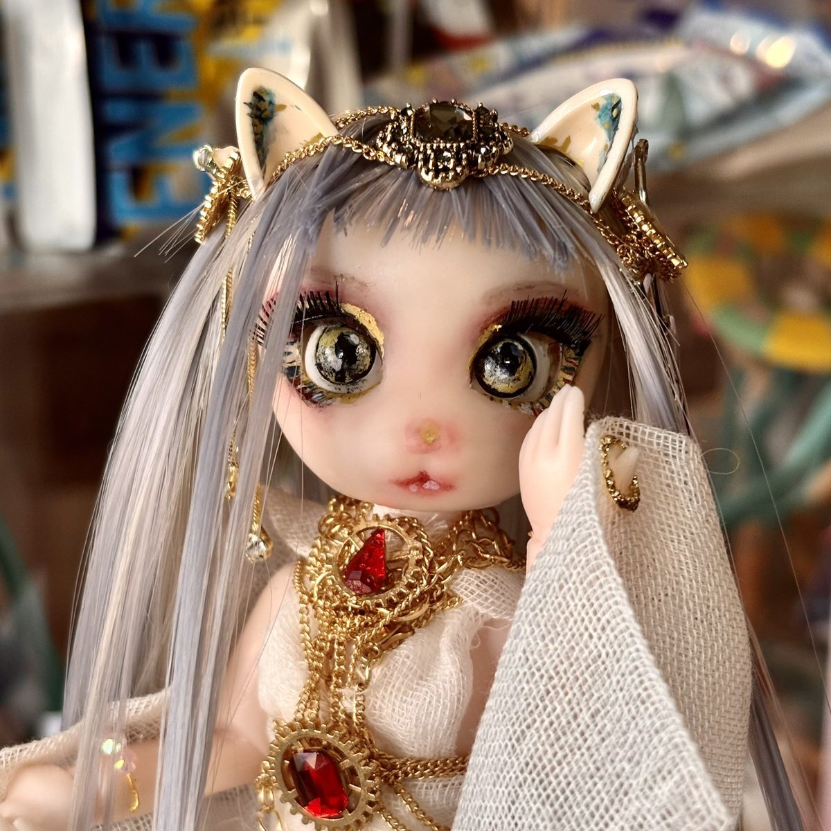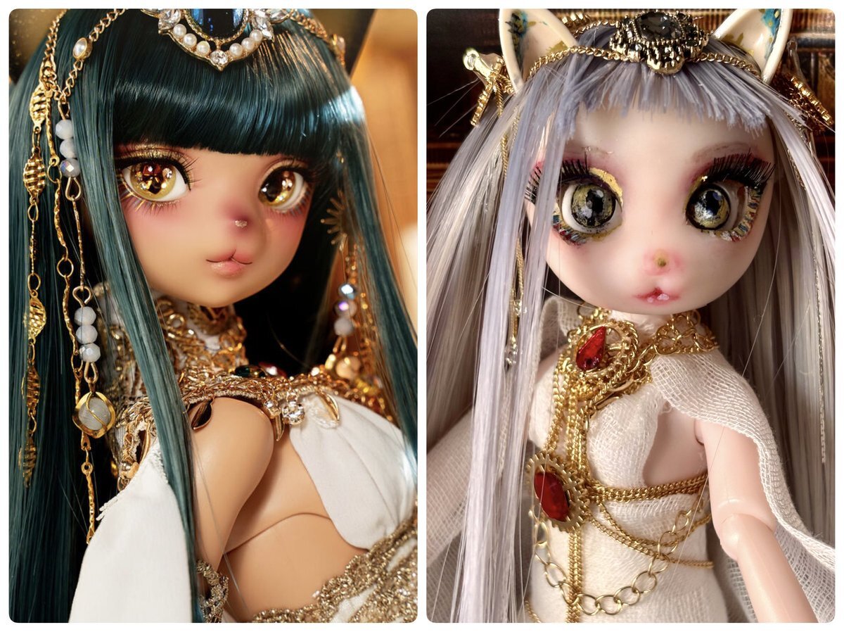 100均バステト、仕上がり直前✨ ガーゼのドレスに、アクセサリーチェーンやメタル系のデコパーツを重ねて、 ぐっとゴージャスな雰囲気に仕上がってきました…! #ドール好きさんと繋がりたい #ドールカスタム x.com/yoku0729/statu…