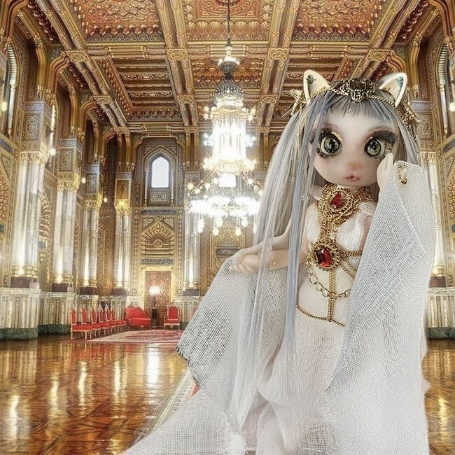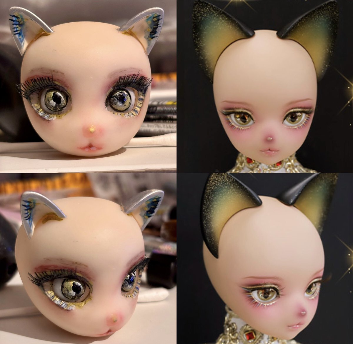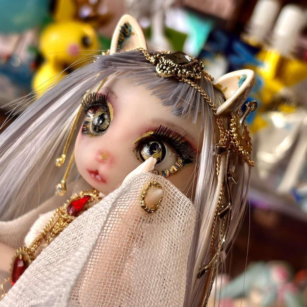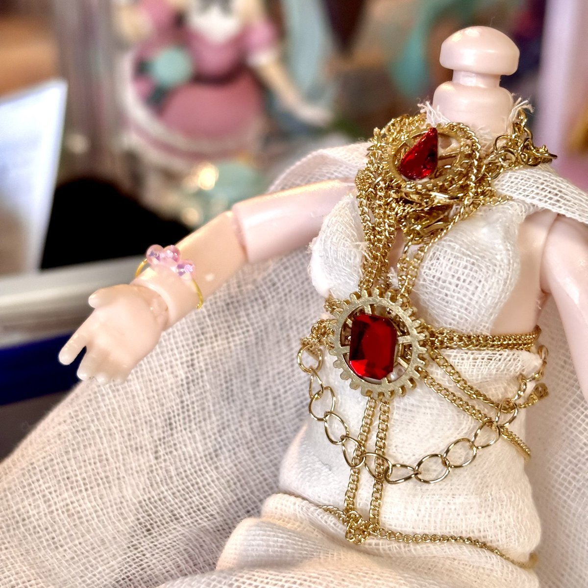 100均バステト、仕上がり直前✨ ガーゼのドレスに、アクセサリーチェーンやメタル系のデコパーツを重ねて、 ぐっとゴージャスな雰囲気に仕上がってきました…! #ドール好きさんと繋がりたい #ドールカスタム x.com/yoku0729/statu…