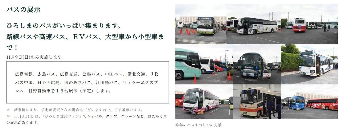ひろしまバスまつり キタ――(゚∀゚)――!!😃 公式HP版より⬇️ bus-matsuri.com/contents.html 注意:バスの展示は #11月9日 (日曜日) のみ pic.x.com/rRieArhSkd