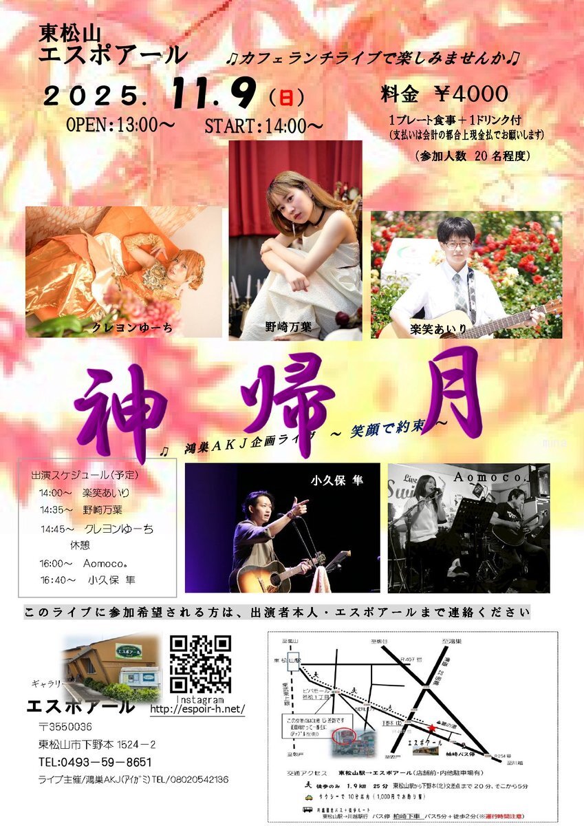 #東松山エスポアールライブ #11月9日(日) 料金4000円 #神帰月 open 13:00/start14:00 出演 #楽笑あいり #野崎万葉 #クレヨンゆーち #Aomoco. #小久保隼 pic.x.com/aF9TxOt197