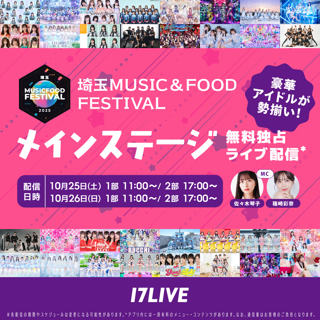 ◤埼玉ミュージック&フードフェスティバル◢ // 豪華アイドルが勢揃いの『メインステージ』を #17LIVE で独占ライブ配信決定📡🎊 \\ 配信アカウント▶️17appv2.onelink.me/D7OH/hh1bdvo1 事前にフォローして待っててね🌟 明日から出演アーティストをカウントダウン形式で紹介🎤 @saitamafes2025