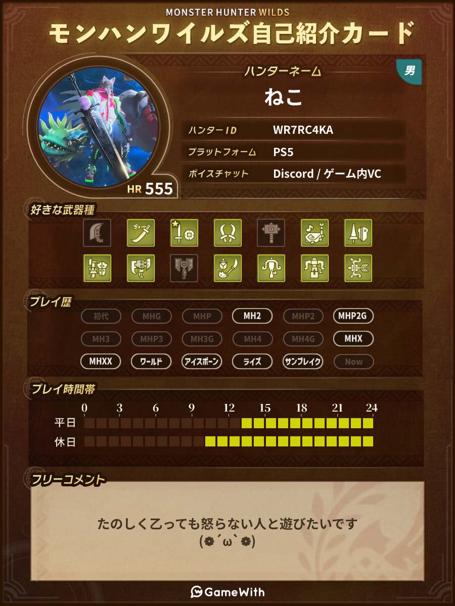 モンハンワイルズ仲間募集です ハンターランクや腕は気にしてません 乙っても笑えるようなエンジョイ勢のあなた お待ちしてます(❁´ω`❁) お互いに仲良くなればサークルに招待も考えてます (❁´ω`❁) #モンハンワイルズ #ワイルズ募集 #フレンド募集 #20歳以上 #ワイルズ自己紹介カード pic.x.com/NN63gJr9eR