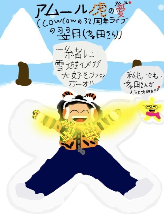「COWCOWさんの32周年ライブの翌日」 最後のライブの翌日は,ツッコミもボケもそれぞれ違う冬休みを過ごすことが多い。多田さんは雪の中で遊び,善しさんは冬眠する。 #あたりまえ体操 #COWCOW #COWCOW32周年ライブ #32周年 #雪遊び #冬眠 #くまのプーさん #ティガー #COWCOW32周年ライブの翌日 #冬 pic.x.com/rrs4BOlo9A