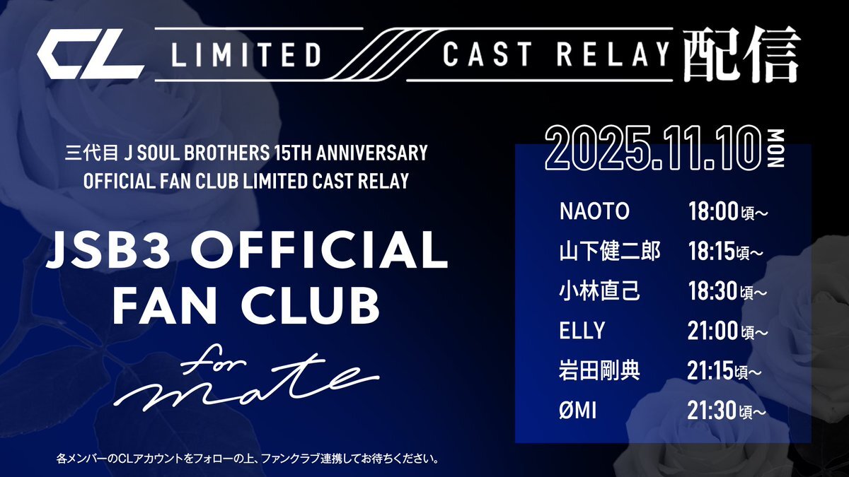 本日11/10(月) #三代目JSOULBROTHERS 15TH ANNIVERSARY オフィシャルファンクラブ会員限定🌹 #CL キャスリレーを行います📱 MATEの皆様、 ぜひ各メンバーのCLアカウントをフォローの上、ファンクラブ連携してお待ちください。 🌹すでにファンクラブに入会済みの方で、まだ連携がお済みでない場合は