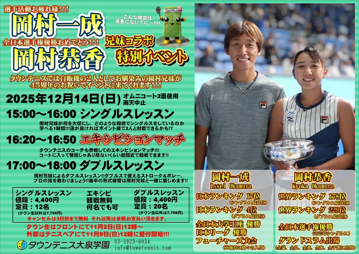 いよいよ明日になりました! なんとか天気も大丈夫そうです! シェア遅くなりましたが ダブルスの方はまだあと数枠 空きがあるそうなので是非 申し込みお待ちしております! #タウンテニス大泉学園 #45周年 #岡村兄妹 #岡村一成 #岡村恭香 #たうてに x.com/tautenikun/sta…