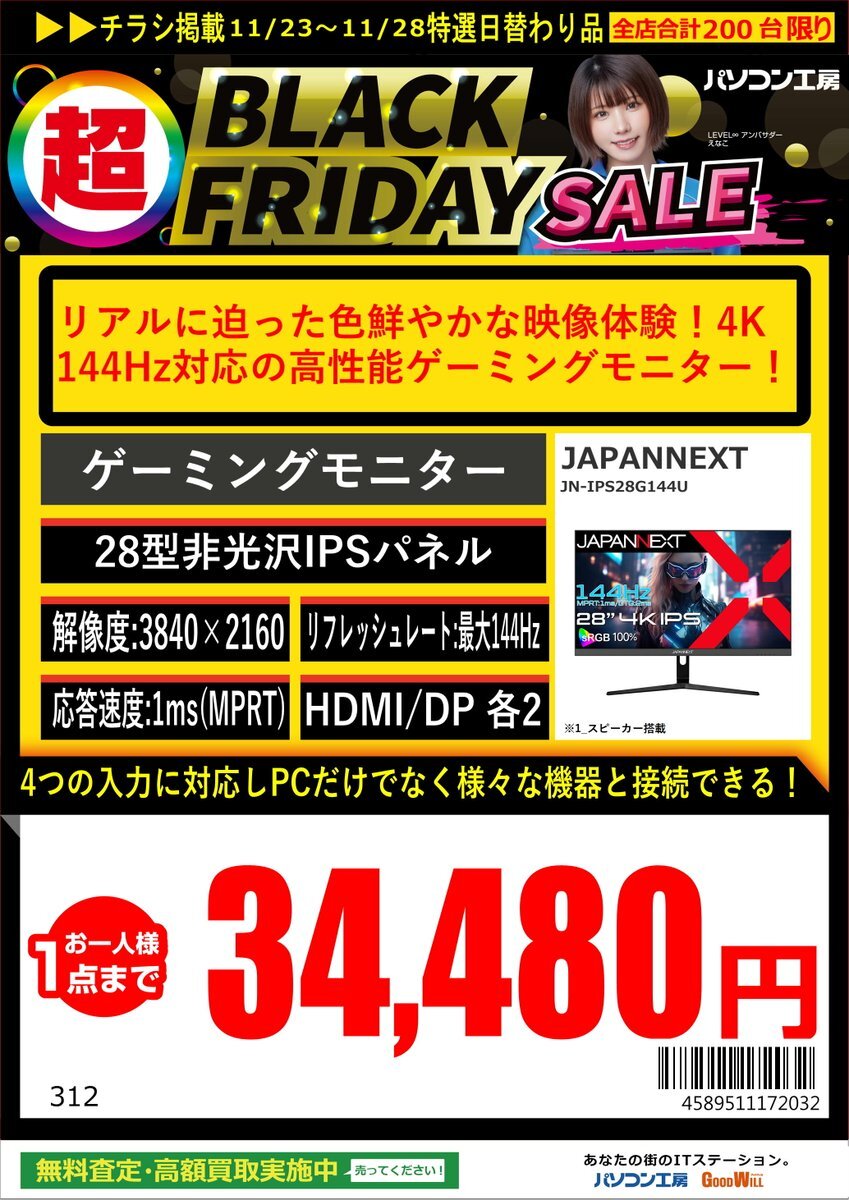 🎊超BLACK FRIDAYセール‼️🎊 ただいま開催中✨ おすすめ商品をご案内‼️ #JAPANNEXT JN-IPS28G144U 税込34,480円 #4K #144Hz 対応の #ゲーミングモニター です👍 他にもお得な商品が多数ございます‼️ 是非ご来店ください😉 #パソコン工房 #山形 pic.x.com/sRkQG0Bu0I