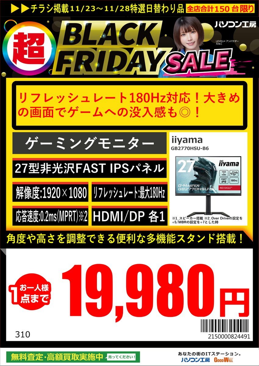 ⭐️お得なお知らせ⭐️ BLACK FRIDAYセール開催中! 今週のセール商品はこちら! ご来店お待ちしております♪ #パソコン工房 #岡山 #ゲーミング #モニター #JAPANNEXT #4K #iiyama pic.x.com/f2sgtzyfUS