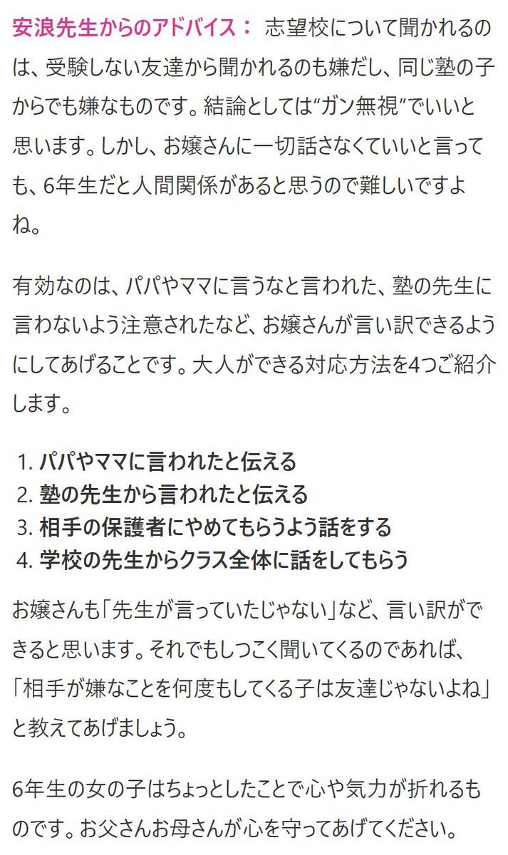 「受験校どこ?」「なんでその学校?」 お友達に聞かれて困るお子さま、多いようです。 #安浪京子 先生 #小川大介 先生によると、親が「言い訳できる言葉」を一緒に準備してあげるだけで、子どもはずっと楽に。 #中学受験 #6年生 #子育て pic.x.com/lnwY6b8o4m