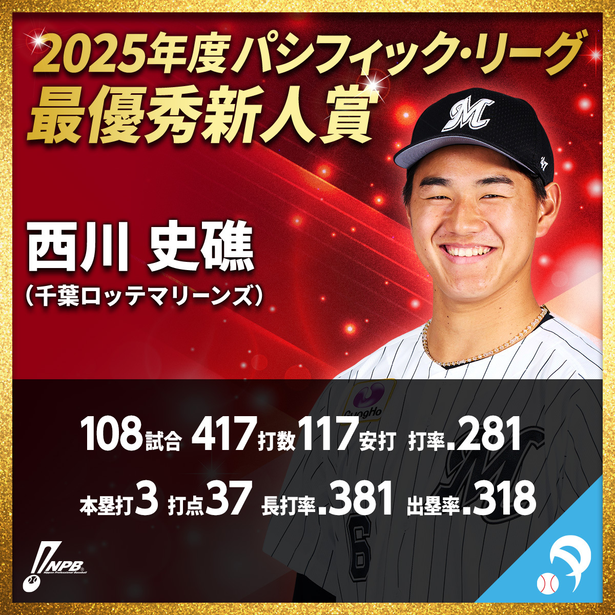 本日11/26(水)に開催された「NPB AWARDS 2025 supported by リポビタンD」において、2025年度パ・リーグ最優秀新人賞(新人王)が発表され、#西川史礁 選手が受賞しましたのでお知らせします。 ▼marines.co.jp/news/detail/20… #chibalotte #NPBAWARD
