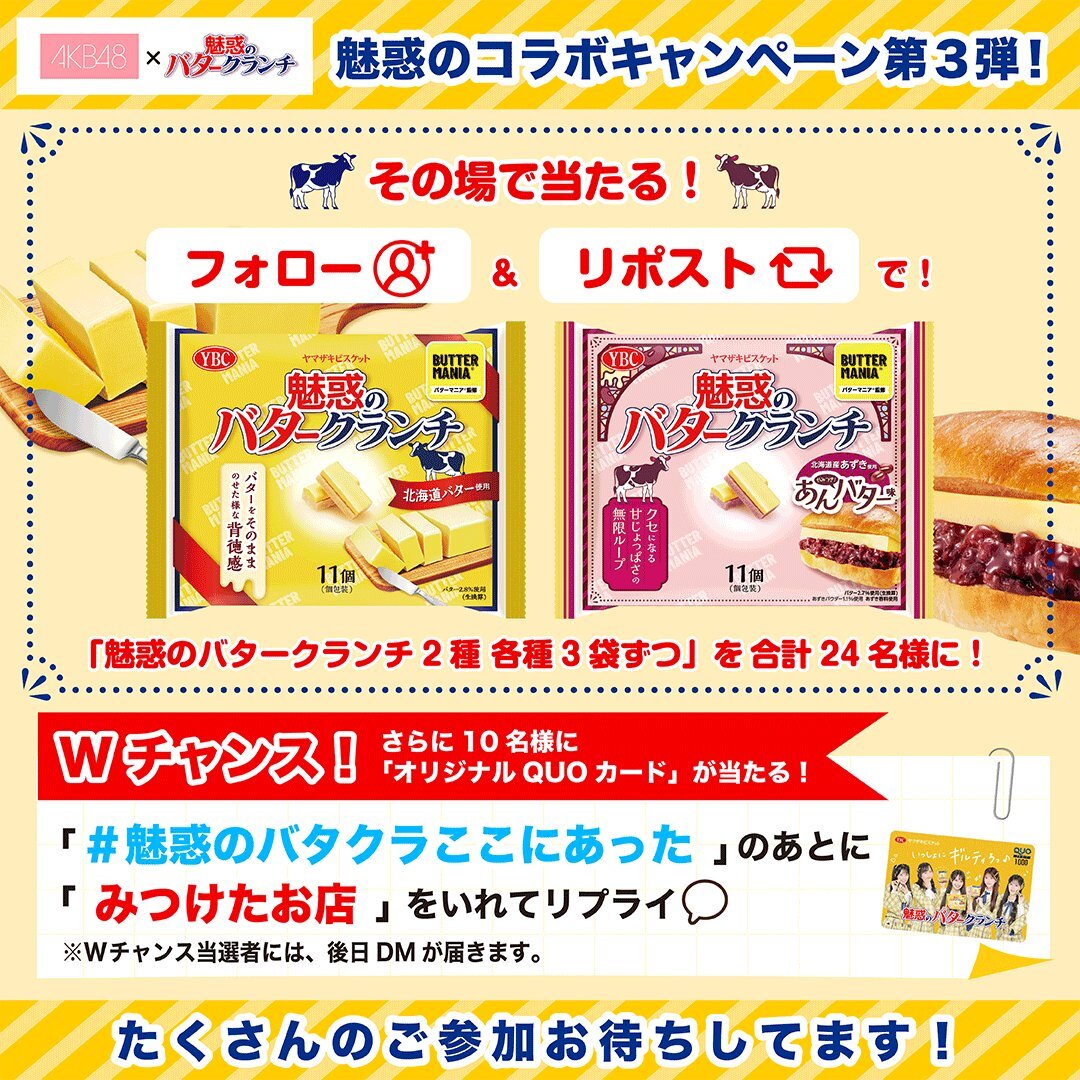 #AKB× #魅惑のバタークランチ コラボキャンペーン #プレゼント企画 魅惑のバタクラ2種を3袋ずつのプレゼントに応募するのでよろしくお願いします! Wチャンス #魅惑のバタクラここにあった 「みつけたお店」YBCスーパー新宿店 オリジナルQUOカードプレゼントに応募するのでよろしくお願いします! x.com/YBC_jp/status/…