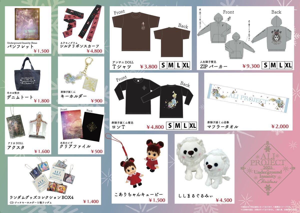 【お知らせ】 「ALI PROJECT 2025~Underground Insanity Christmas」グッズ ラインナップ・会場販売に関して aliproject.jp/content1?no=t5… #勇侠会 #yukyokai #ALIPROJECT #宝野アリカ #片倉三起也