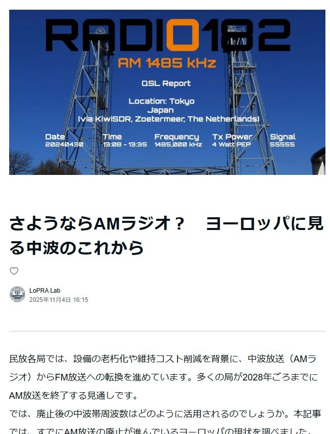 「さようならAMラジオ?」 日本でも2028年までに多くのAM局がFMへ移行します。 その後、空いた中波帯はどうなるのか? 先行するヨーロッパの現状を調べました。 note.com/lopra_lab/n/n8… #AMラジオ #FM転換 #ヨーロッパ #放送のこれから #メディアの未来 pic.x.com/eVkgDDnfma