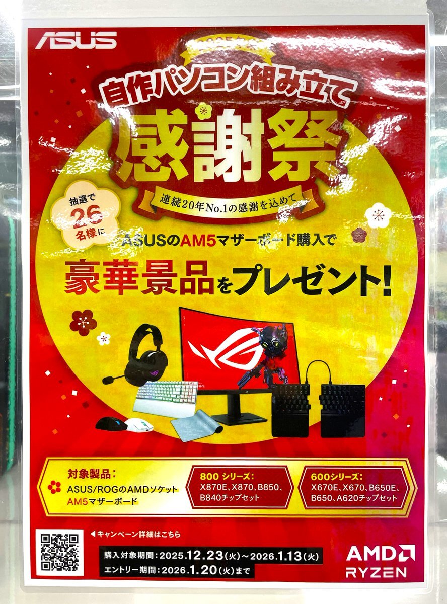 【PCパーツ】 ⇩本日よりスタートしたコチラのキャンペーン!⇩ #ASUS のAM5マザーご購入で豪華景品をプレゼント 対象商品ご購入後に専用サイトで応募するとASUSのゲーミングデバイスが当たるようです 来年の1/13までのキャンペーンになっています #ツクモ #札幌 pic.x.com/XG6PDJQN0U