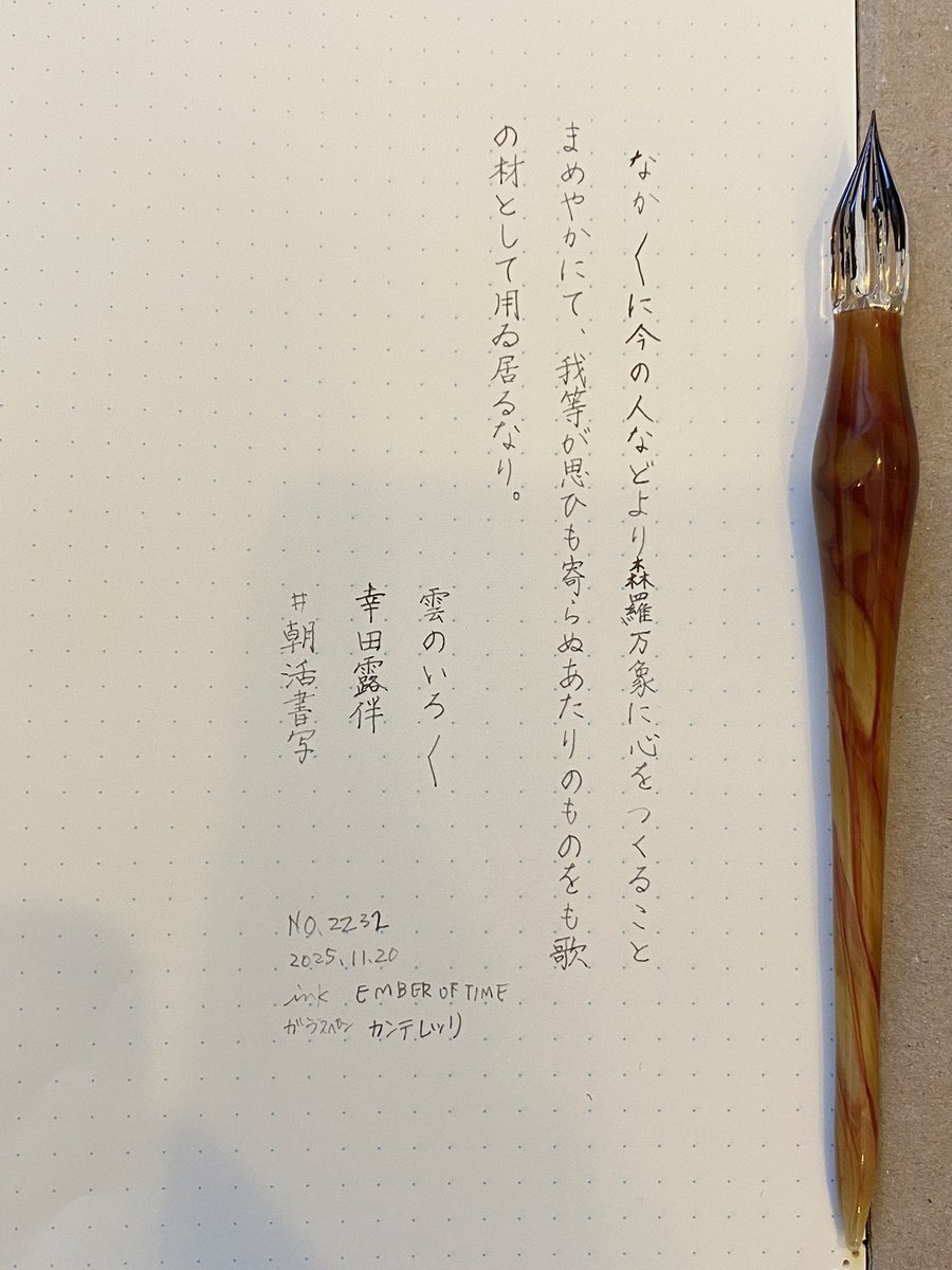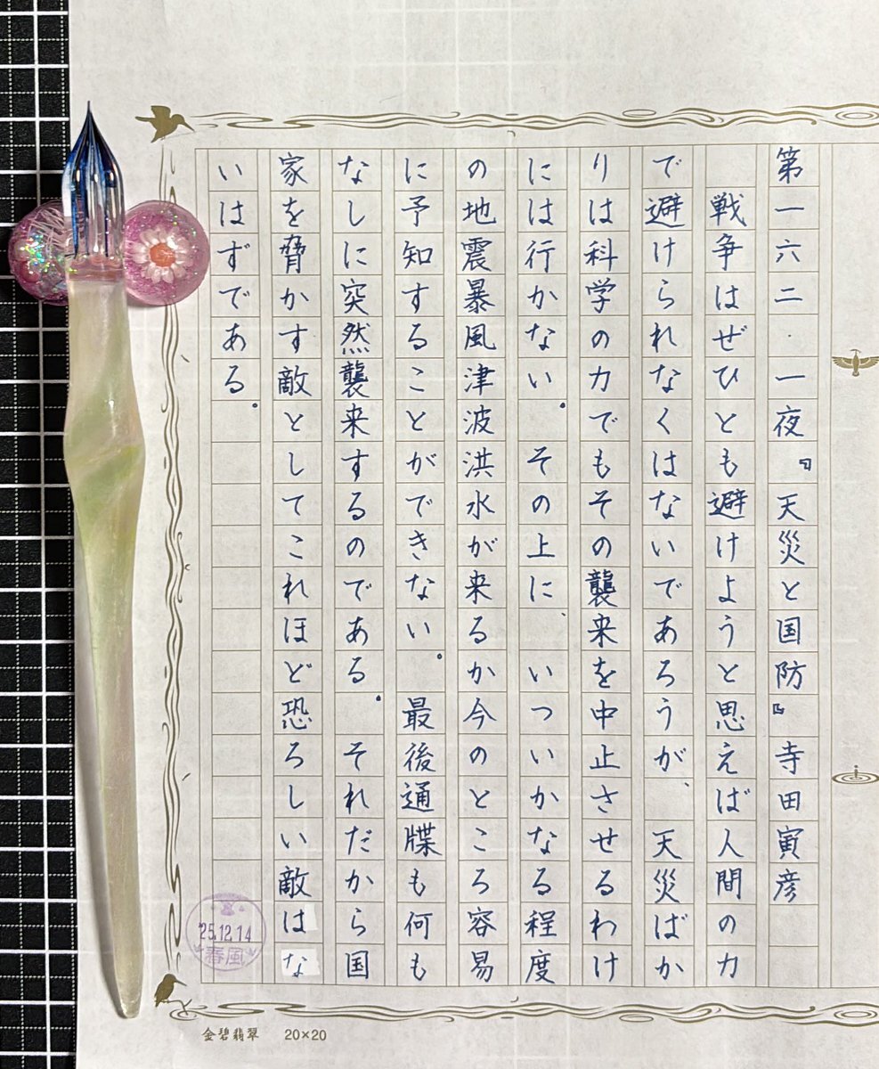 お題ありがとうございます🍀.* 久しぶりに #aun さんのガラスペンで書きました インク 石丸文行堂 長崎美景 眼鏡橋ハイドレンジアブルー 今日は赤穂浪士討入りでしたね #吾輩ノ書写デアルナンバー9 #あたぼう原稿用紙 金碧翡翠 pic.x.com/vKAXsA8a4b x.com/kennmeow1/stat…