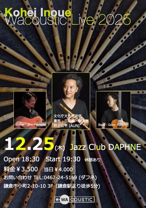 12.25(木) Jazz Club DAPHNE Open 18:30 Start 19:30 休憩あり 料金¥3.500 当日¥4.000 お問い合わせ TEL:0467-24-5169 (ダフネ) 鎌倉市小町2-10-10 3F(鎌倉駅より徒歩5分) #AUN #AUNJ #和楽器 #三味線 #篠笛 #太鼓 #和太鼓 #taiko #shamisen #shinobue #井上公平 pic.x.com/yXd7fSrEwq